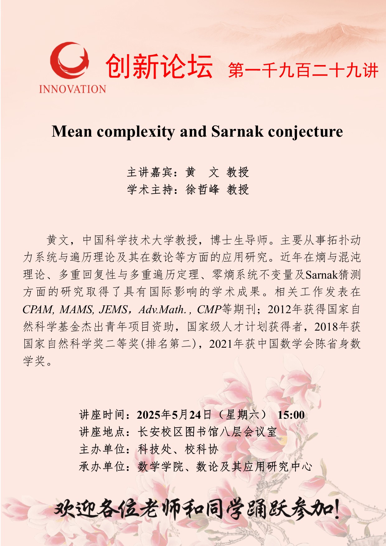 黄文 教授 欧冠官方网站创新论坛第一千九百二十九讲:Mean complexity and Sarnak conjecture 讲座时间 2025年5月24日(星期六) 15:00 讲座地点 长安校区图书馆八层会议室 讲座人介绍 黄文 教授 讲座内容