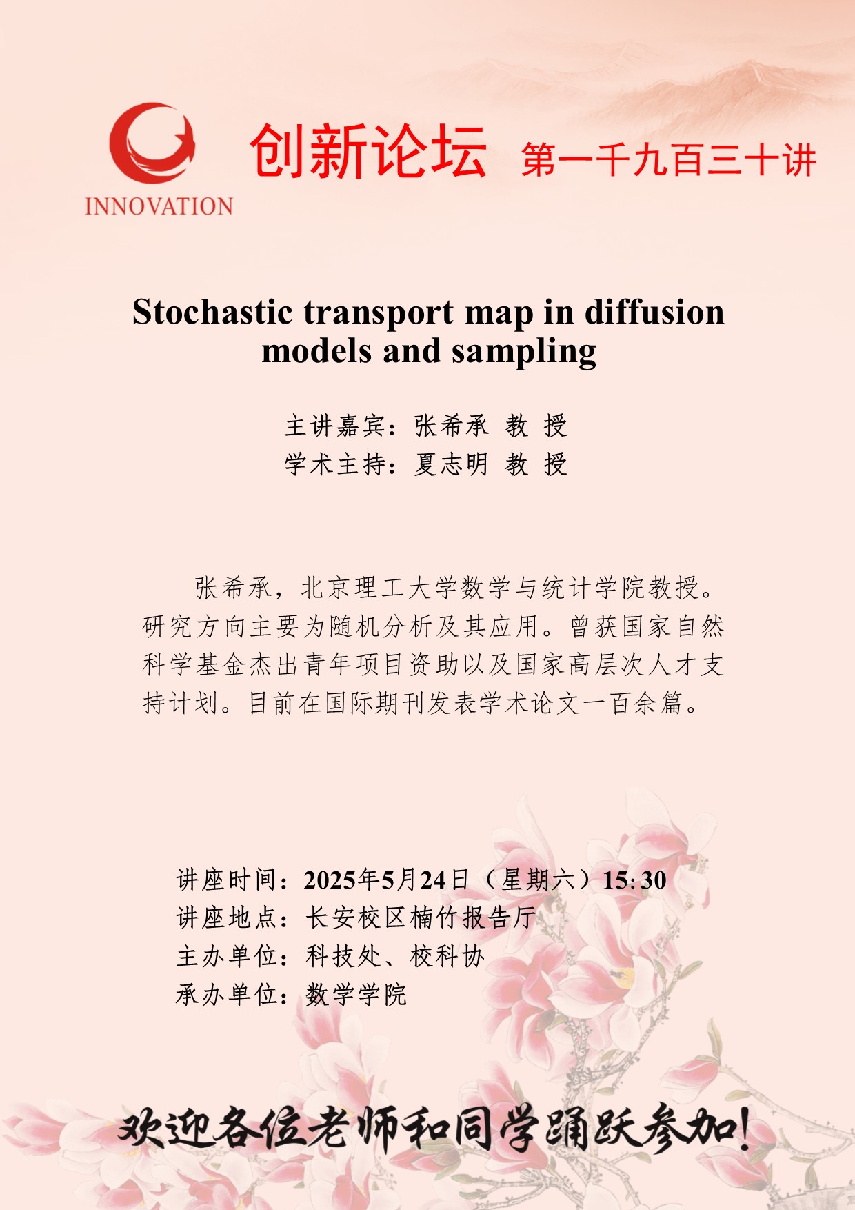 张希承 教授 欧冠官方网站创新论坛第一千九百三十讲:Stochastic transport map in diffusion models and sampling 讲座时间 2025年5月24日(星期六)15:30 讲座地点 长安校区楠竹报告厅 讲座人介绍 张希承 教授 讲座内容