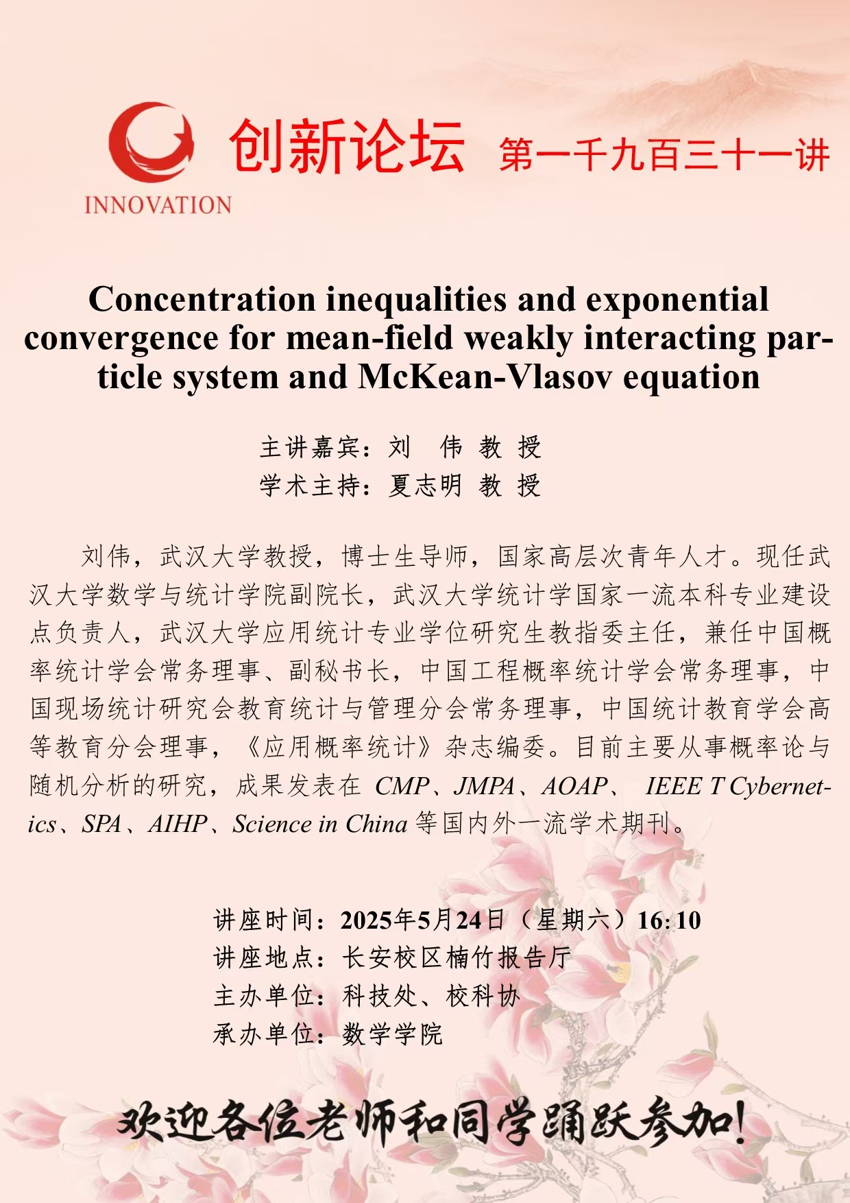 刘伟 教授 欧冠官方网站创新论坛第一千九百三十一讲:Concentration inequalities and exponential convergence for mean-field weakly interacting particle system and McKean-Vlasov equation 讲座时间 2025年5月24日(星期六)16:10 讲座地点 长安校区楠竹报告厅 讲座人介绍 刘伟 教授 讲座内容