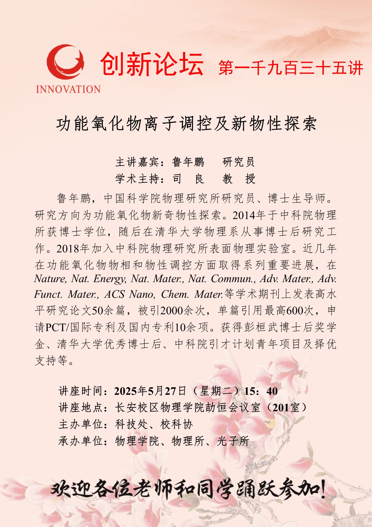 鲁年鹏 研究员 欧冠官方网站创新论坛第一千九百三十五讲:功能氧化物离子调控及新物性探索 讲座时间 2025年5月27日(星期二)15:40 讲座地点 长安校区物理学院劼恒会议室(201室) 讲座人介绍 鲁年鹏 研究员 讲座内容