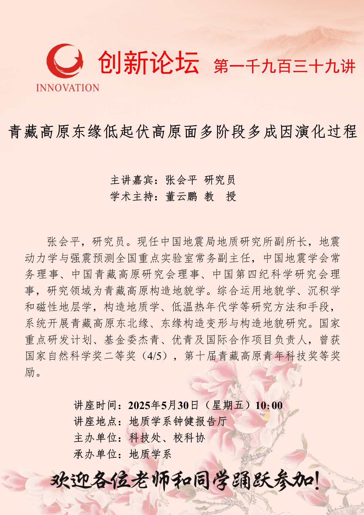 张会平 研究员 欧冠官方网站创新论坛第一千九百三十九讲:青藏高原东缘低起伏高原面多阶段多成因演化过程 讲座时间 2025年5月30日(星期五)10:00 讲座地点 地质学系钟健报告厅 讲座人介绍 张会平 研究员 讲座内容