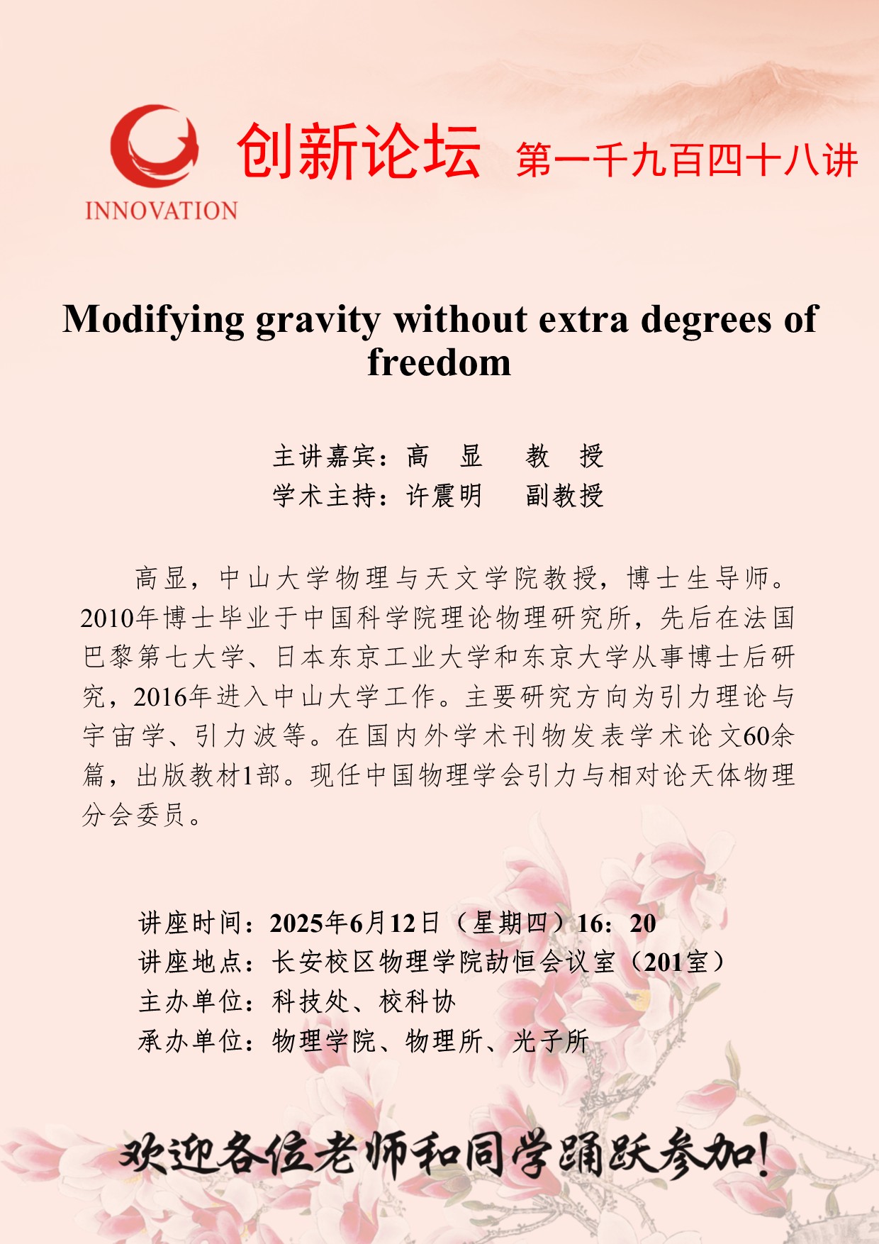 高显 教授 欧冠官方网站创新论坛第一千九百四十八讲:Modifying gravity without extra degrees of freedom 讲座时间 2025年6月12日(星期四)16:20 讲座地点 长安校区物理学院劼恒会议室(201室) 讲座人介绍 高显 教授 讲座内容