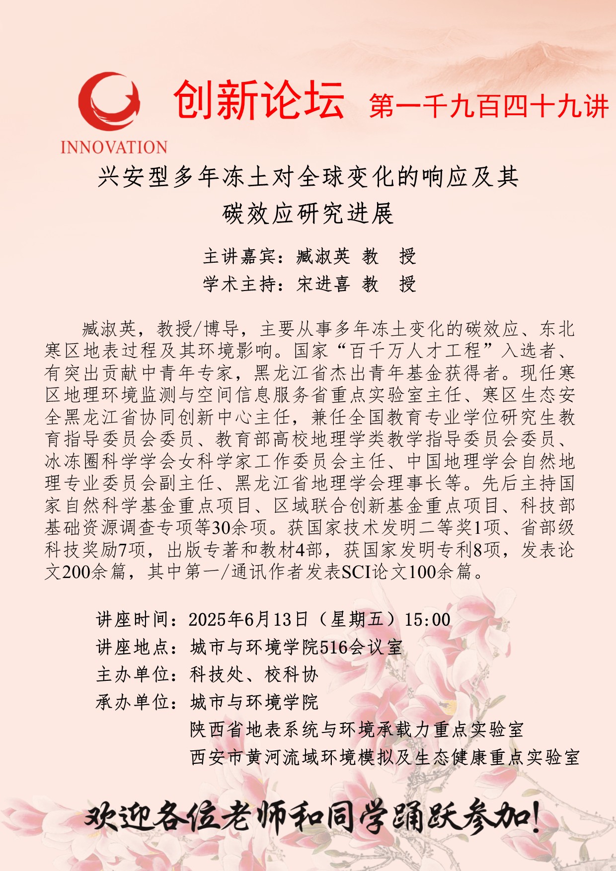 臧淑英 教授 欧冠官方网站创新论坛第一千九百四十九讲:兴安型多年冻土对全球变化的响应及其碳效应研究进展 讲座时间 2025年6月13日(星期五)15:00 讲座地点 城市与环境学院516会议室 讲座人介绍 臧淑英 教授 讲座内容