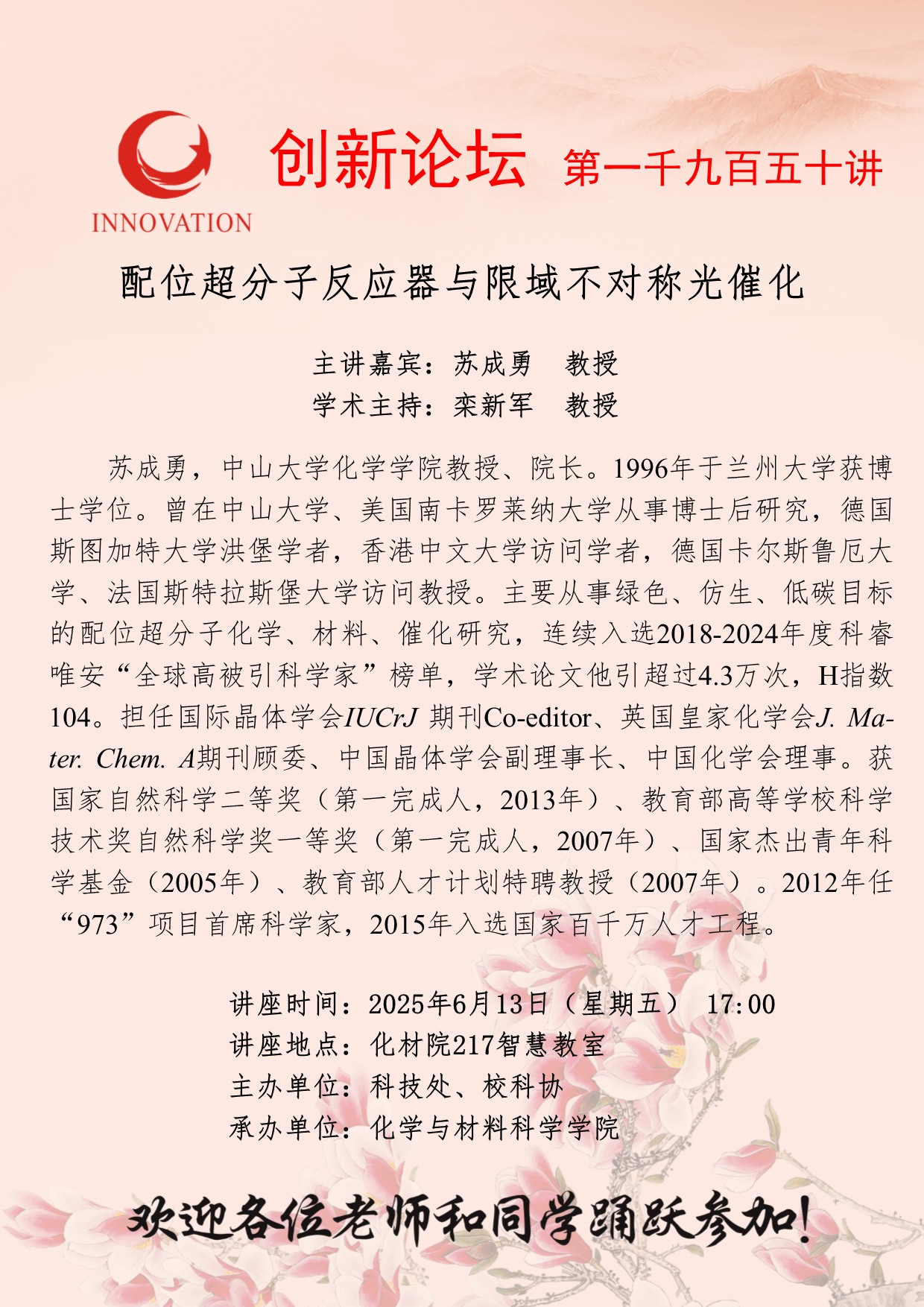 苏成勇 教授 欧冠官方网站创新论坛第一千九百五十讲:配位超分子反应器与限域不对称光催化 讲座时间 2025年6月13日(星期五) 17:00 讲座地点 化材院217智慧教室 讲座人介绍 苏成勇 教授 讲座内容