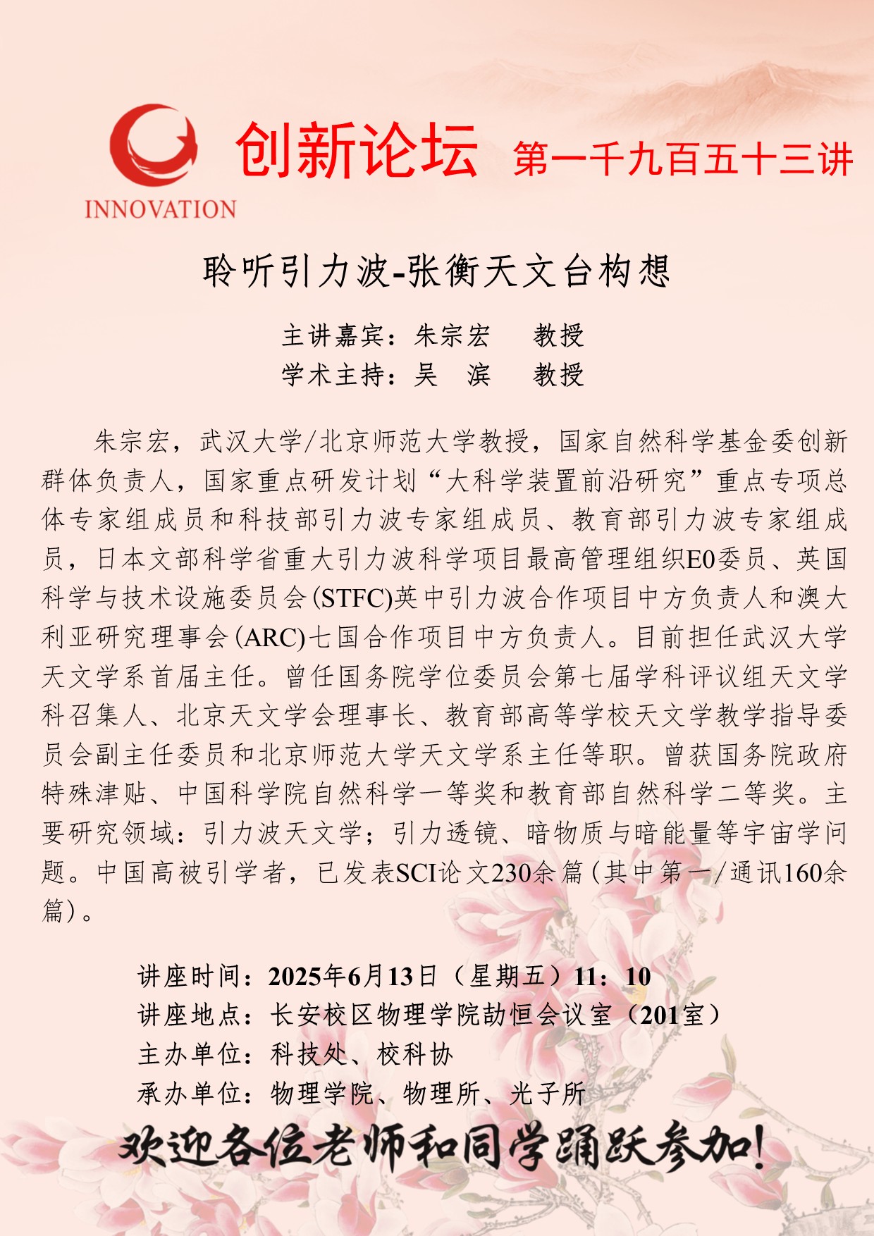 朱宗宏 教授 欧冠官方网站创新论坛第一千九百五十三讲:聆听引力波-张衡天文台构想 讲座时间 2025年6月13日(星期五)11:10 讲座地点 长安校区物理学院劼恒会议室(201室) 讲座人介绍 朱宗宏 教授 讲座内容
