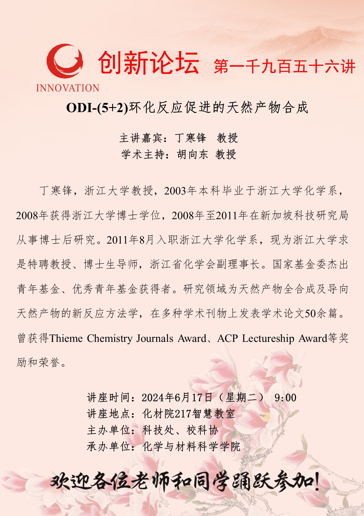 丁寒锋 教授 欧冠官方网站创新论坛第一千九百五十六讲:ODI-(5+2)环化反应促进的天然产物合成 讲座时间 2024年6月17日(星期二) 9:00 讲座地点 化材院217智慧教室 讲座人介绍 丁寒锋 教授 讲座内容