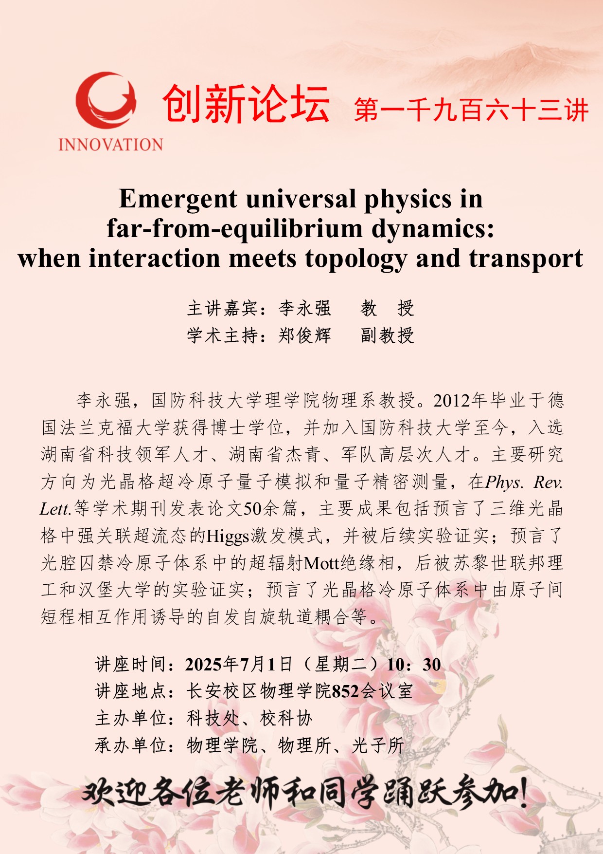 李永强 教授 欧冠官方网站创新论坛第一千九百六十三讲:Emergent universal physics in far-from-equilibrium dynamics: when interaction meets topology and transport 讲座时间 2025年7月1日(星期二)10:30 讲座地点 长安校区物理学院852会议室 讲座人介绍 李永强 教授 讲座内容