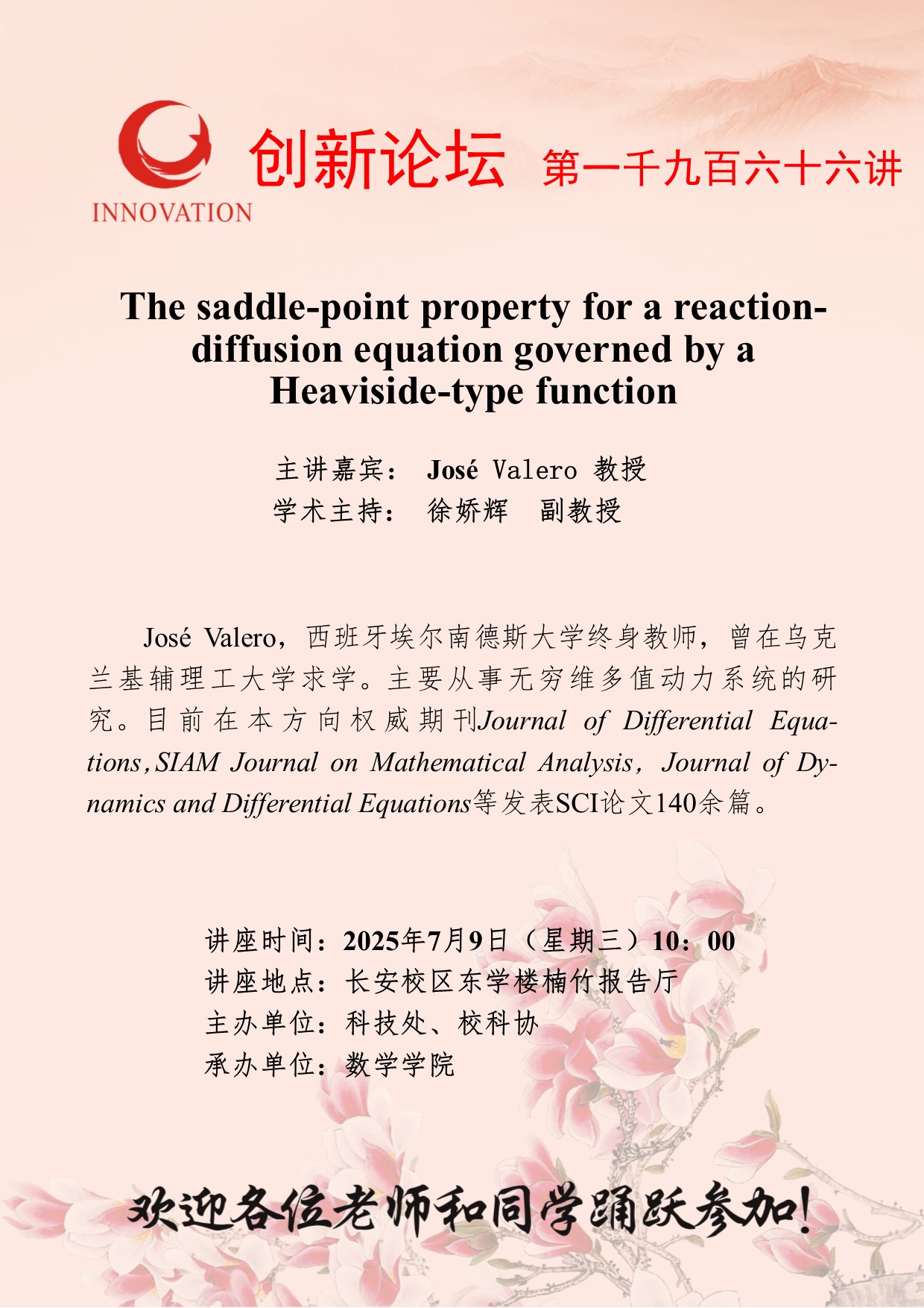 José Valero 教授 欧冠官方网站创新论坛第一千九百六十六讲:The saddle-point property for a reaction-diffusion equation governed by a Heaviside-type function 讲座时间 2025年7月9日(星期三)10:00 讲座地点 长安校区东学楼楠竹报告厅 讲座人介绍 José Valero 教授 讲座内容