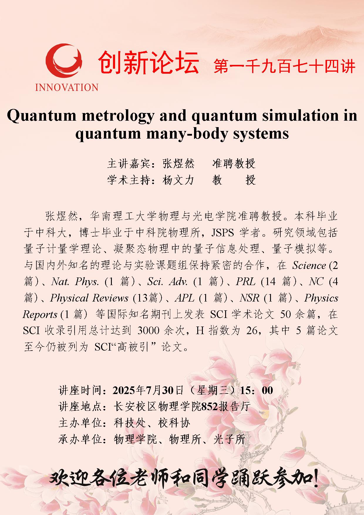 张煜然 准聘教授 欧冠官方网站创新论坛第一千九百七十四讲:Quantum metrology and quantum simulation in quantum many-body systems 讲座时间 2025年7月30日(星期三)15:00 讲座地点 长安校区物理学院852报告厅 讲座人介绍 张煜然 准聘教授 讲座内容