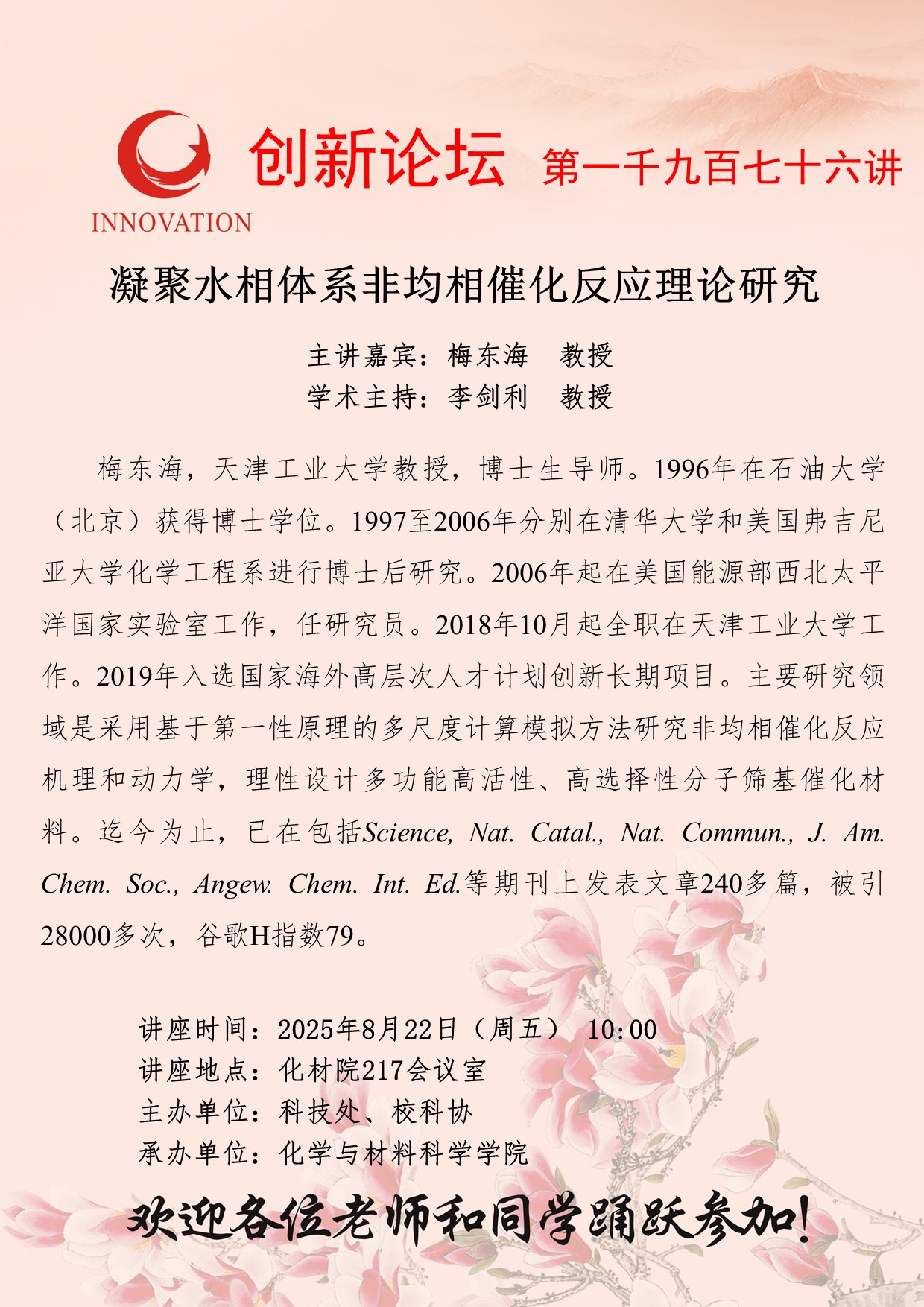 梅东海 教授 欧冠官方网站创新论坛第一千九百七十六讲:凝聚水相体系非均相催化反应理论研究 讲座时间 2025年8月22日(星期五) 10:00 讲座地点 化材学院217智慧教室 讲座人介绍 梅东海 教授 讲座内容