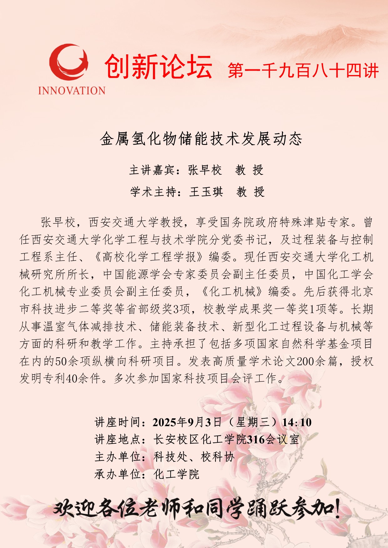 张早校 教授 欧冠官方网站创新论坛第一千九百八十四讲:金属氢化物储能技术发展动态 讲座时间 2025年9月3日(星期三)14:10 讲座地点 长安校区化工学院316会议室 讲座人介绍 张早校 教授 讲座内容