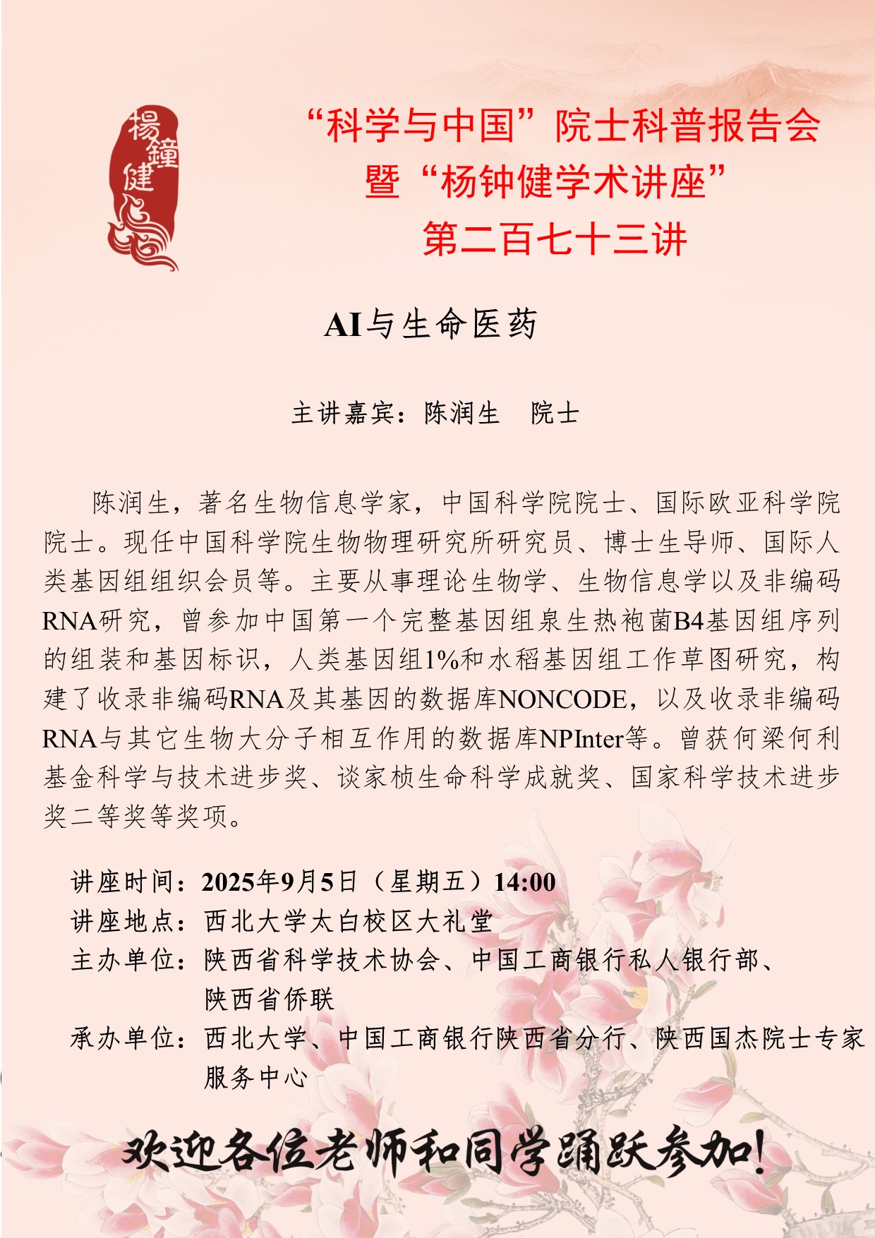 陈润生 院士 “科学与中国”院士科普报告会暨“杨钟健学术讲座”第二百七十三讲:AI与生命医药 讲座时间 2025年9月5日(星期五)14:00 讲座地点 欧冠官方网站太白校区大礼堂 讲座人介绍 陈润生 院士 讲座内容