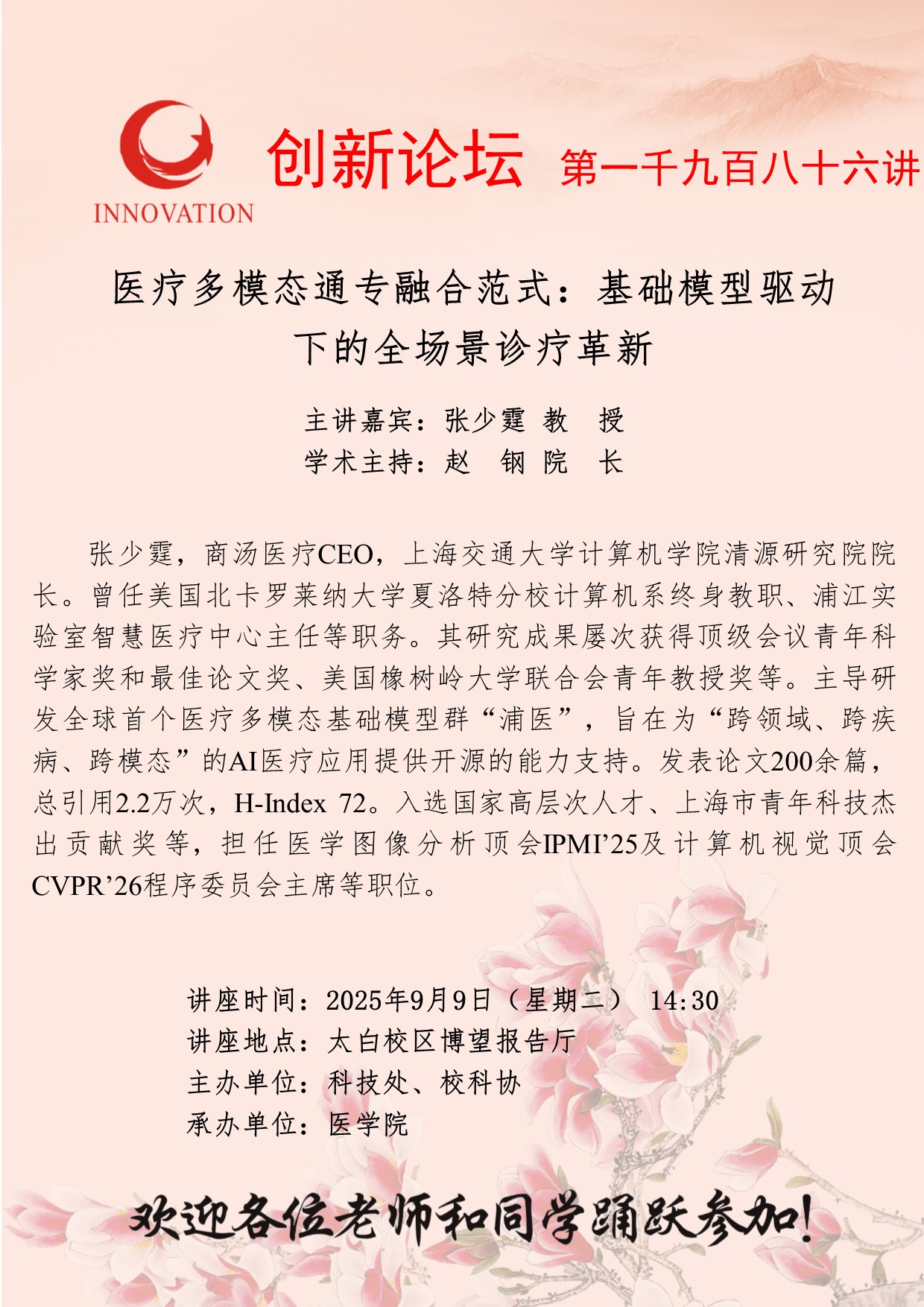 张少霆 教 授 欧冠官方网站创新论坛第一千九百八十六讲:医疗多模态通专融合范式:基础模型驱动下的全场景诊疗革新 讲座时间 2025年9月9日(星期二) 14:30 讲座地点 太白校区博望报告厅 讲座人介绍 张少霆 教 授 讲座内容 fu