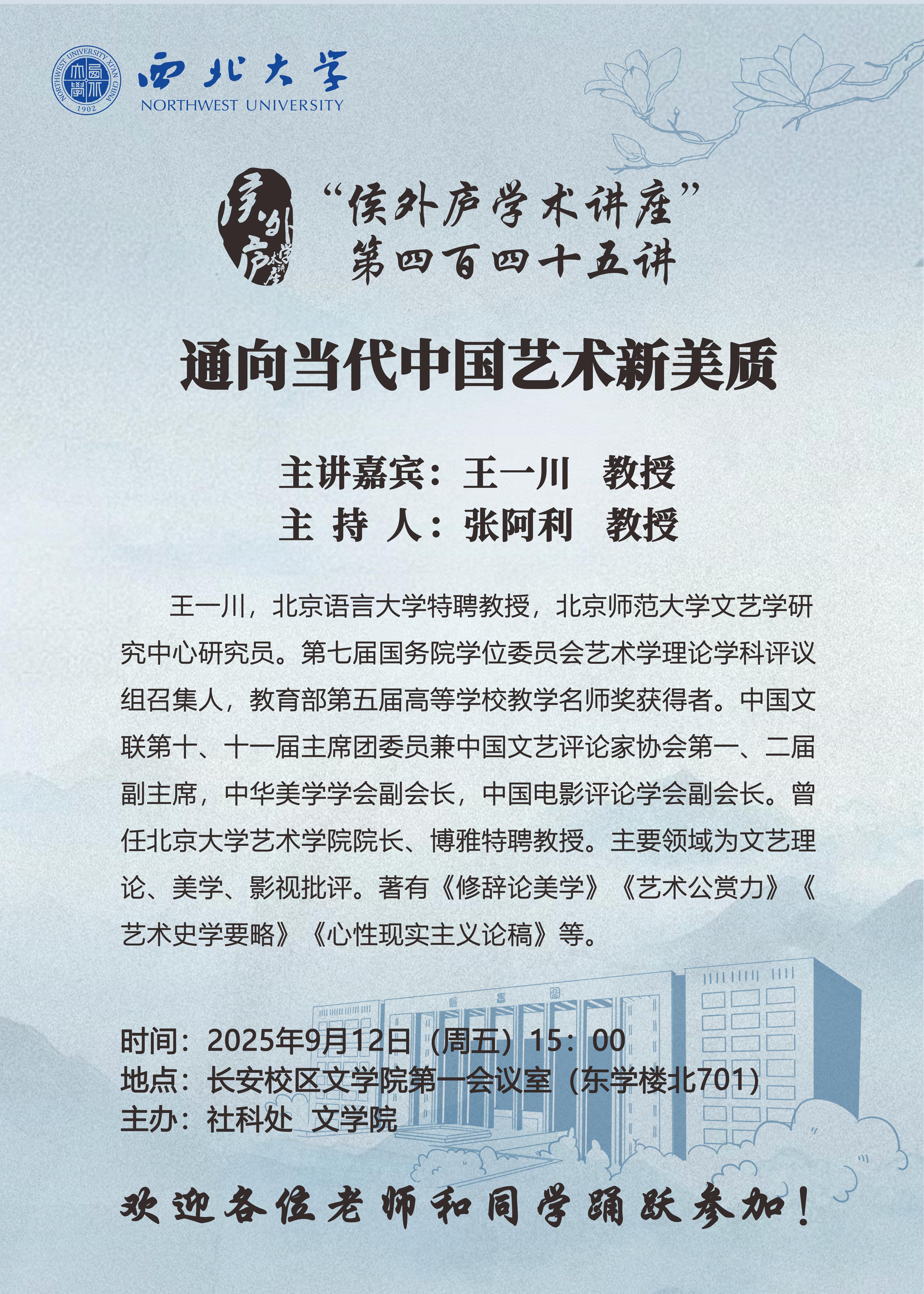王一川 教授 “侯外庐学术讲座”第四百四十五讲:通向当代中国艺术新美质 讲座时间 2025年9月12日(周五)15:00 讲座地点 文学院第一会议室(东学楼北701) 讲座人介绍 王一川 教授 讲座内容