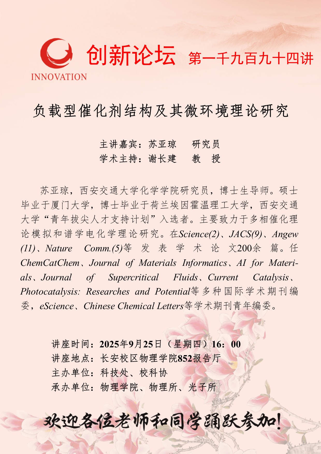 苏亚琼 研究员 欧冠官方网站创新论坛第一千九百九十四讲:负载型催化剂结构及其微环境理论研究 讲座时间 2025年9月25日(星期四)16:00 讲座地点 长安校区物理学院852报告厅 讲座人介绍 苏亚琼 研究员 讲座内容