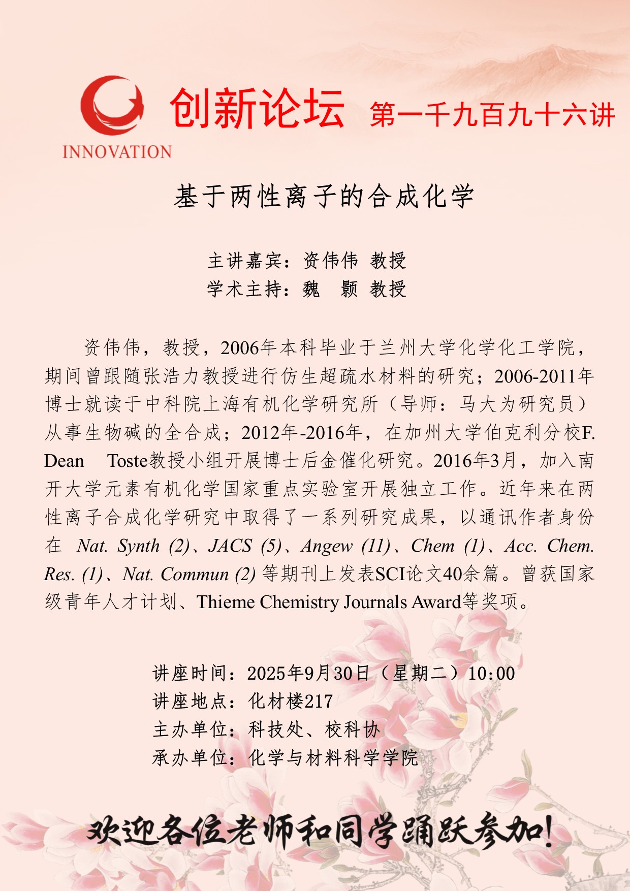 欧冠官方网站创新论坛第一千九百九十六讲: 基于两性离子的合成化学