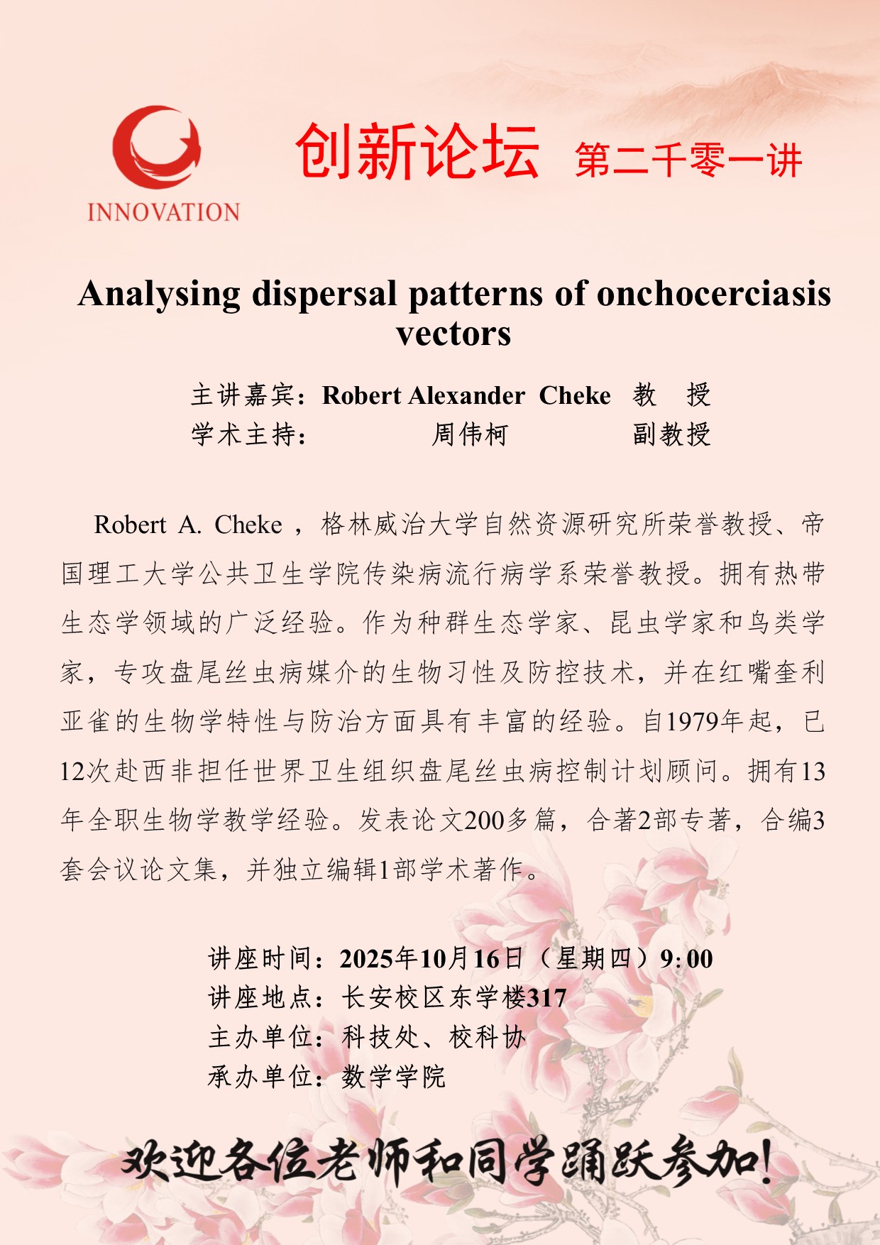 Robert Alexander Cheke 教授 欧冠官方网站创新论坛第二千零一讲:Analysing dispersal patterns of onchocerciasis vectors 讲座时间 2025年10月16日(星期四)9:00 讲座地点 长安校区东学楼317 讲座人介绍 Robert Alexander Cheke 教授 讲座内容