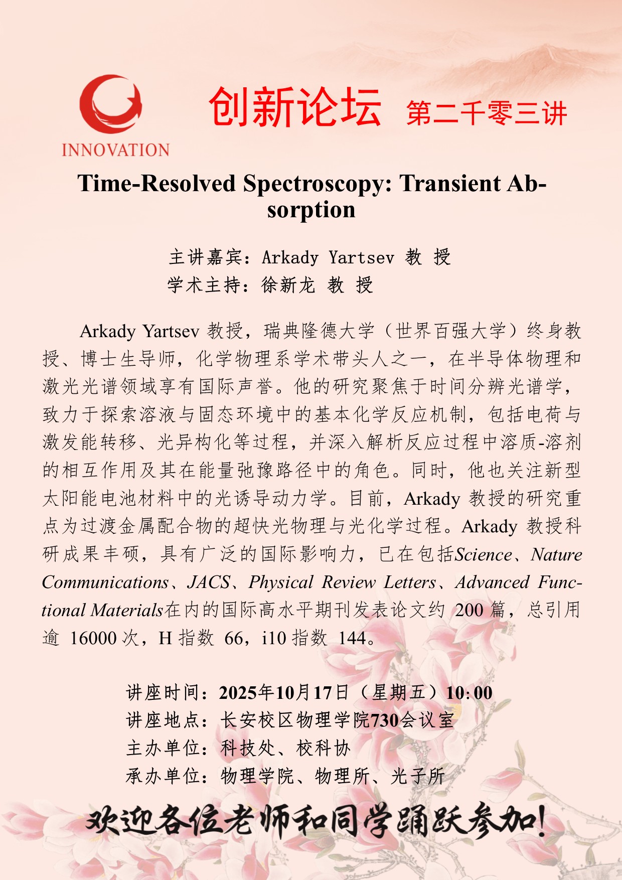 Arkady Yartsev 教授 欧冠官方网站创新论坛第二千零三讲:Time-Resolved Spectroscopy: Transient Absorption 讲座时间 2025年10月17日(星期五)10:00 讲座地点 长安校区物理学院730会议室 讲座人介绍 Arkady Yartsev 教授 讲座内容