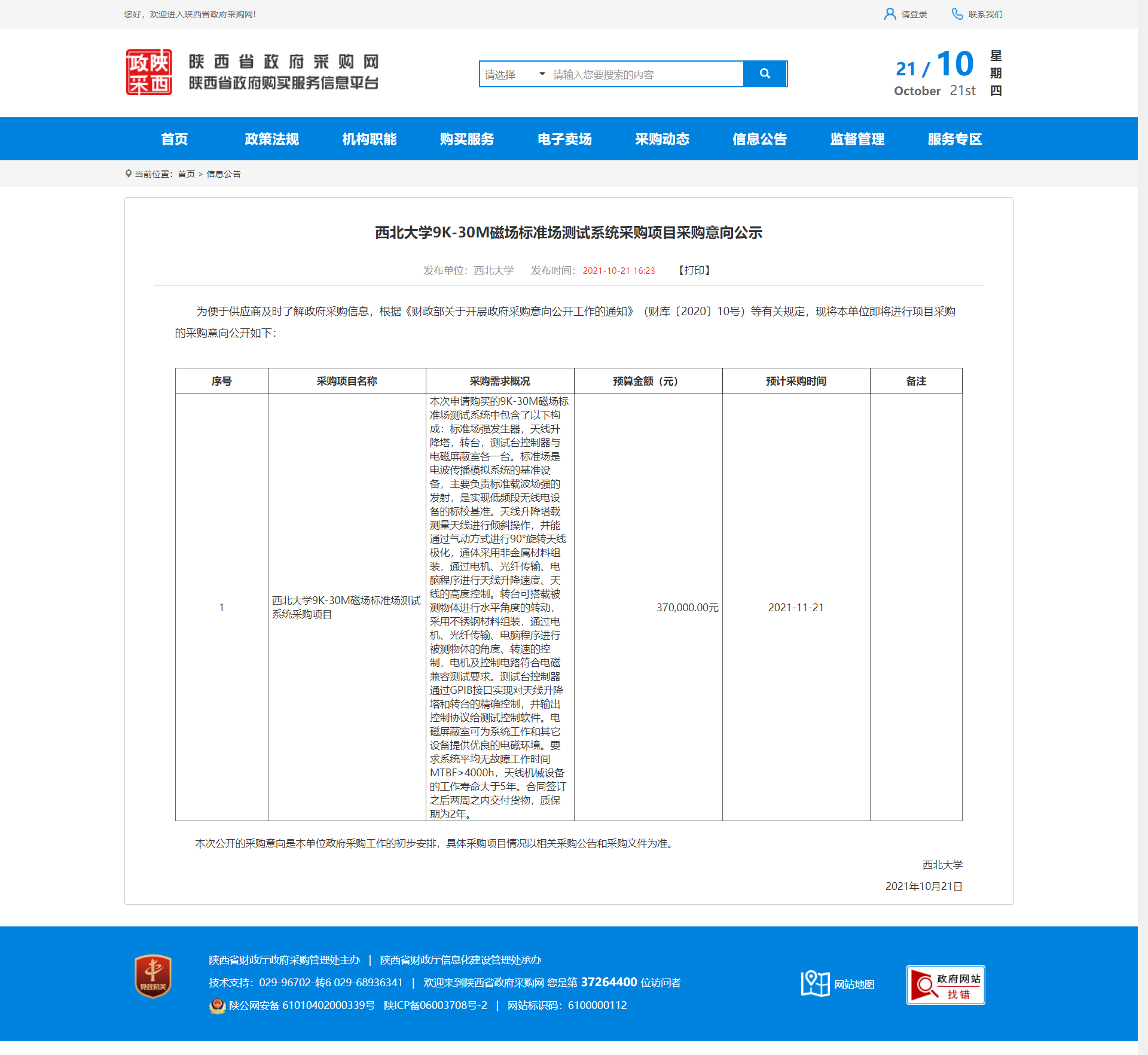 欧冠官方网站9K-30M磁场标准场测试系统采购项目采购意向公示 作者: 编辑:采购与招标办公室 时间:2021-10-21 原公告地址:http://ccgp-shaanxi.gov.cn/notice/noticeDetail.do?noticeguid=8a85be337c20d0b4017ca1bd9ec34088