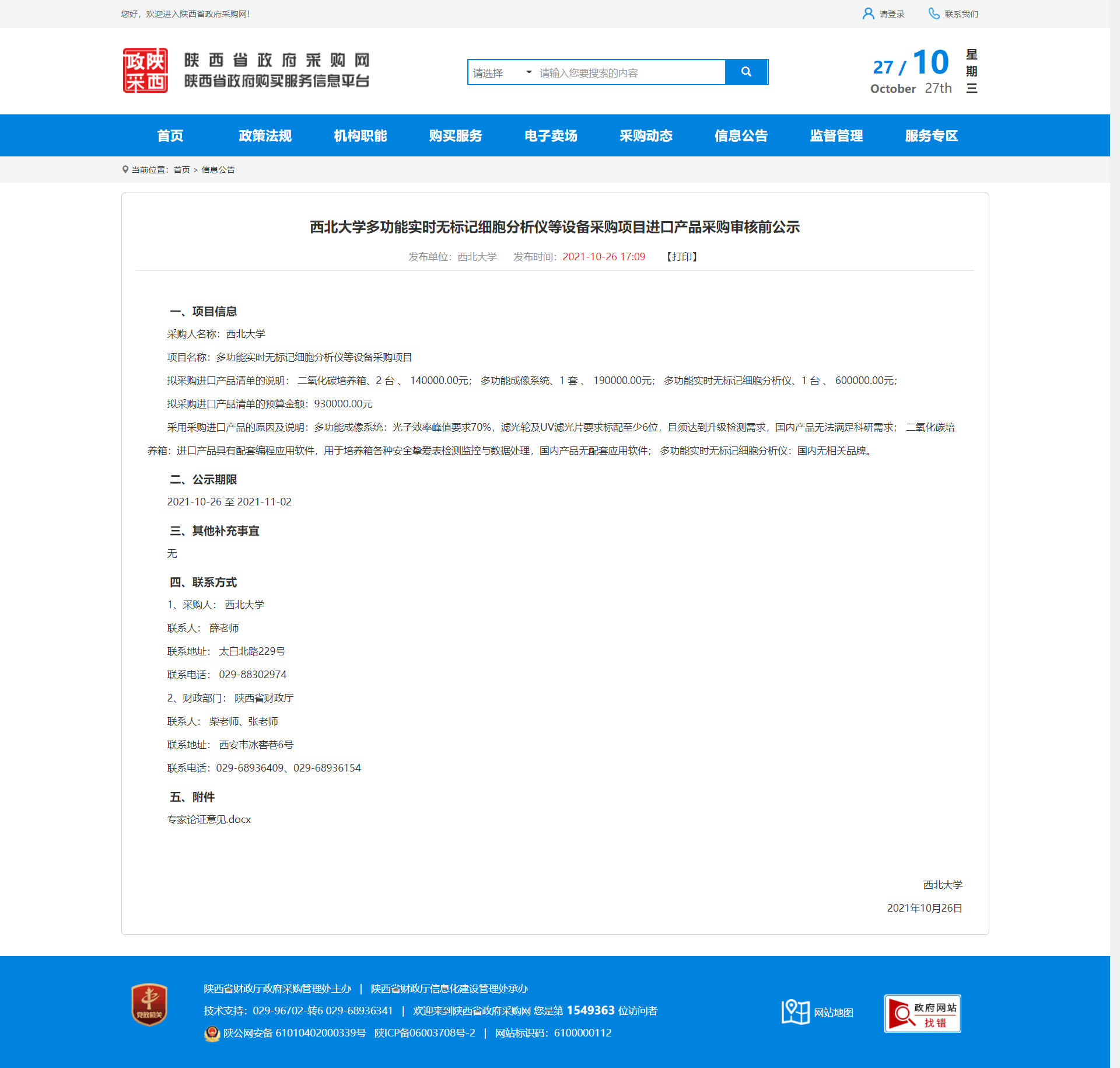 欧冠官方网站多功能实时无标记细胞分析仪等设备采购项目进口产品采购审核前公示 作者: 编辑:薛利娟 时间:2021-10-27 原公告地址:http://www.ccgp-shaanxi.gov.cn/notice/noticeDetail.do?noticeguid=8a85be337c20d0b4017cbbbd74c45f9b