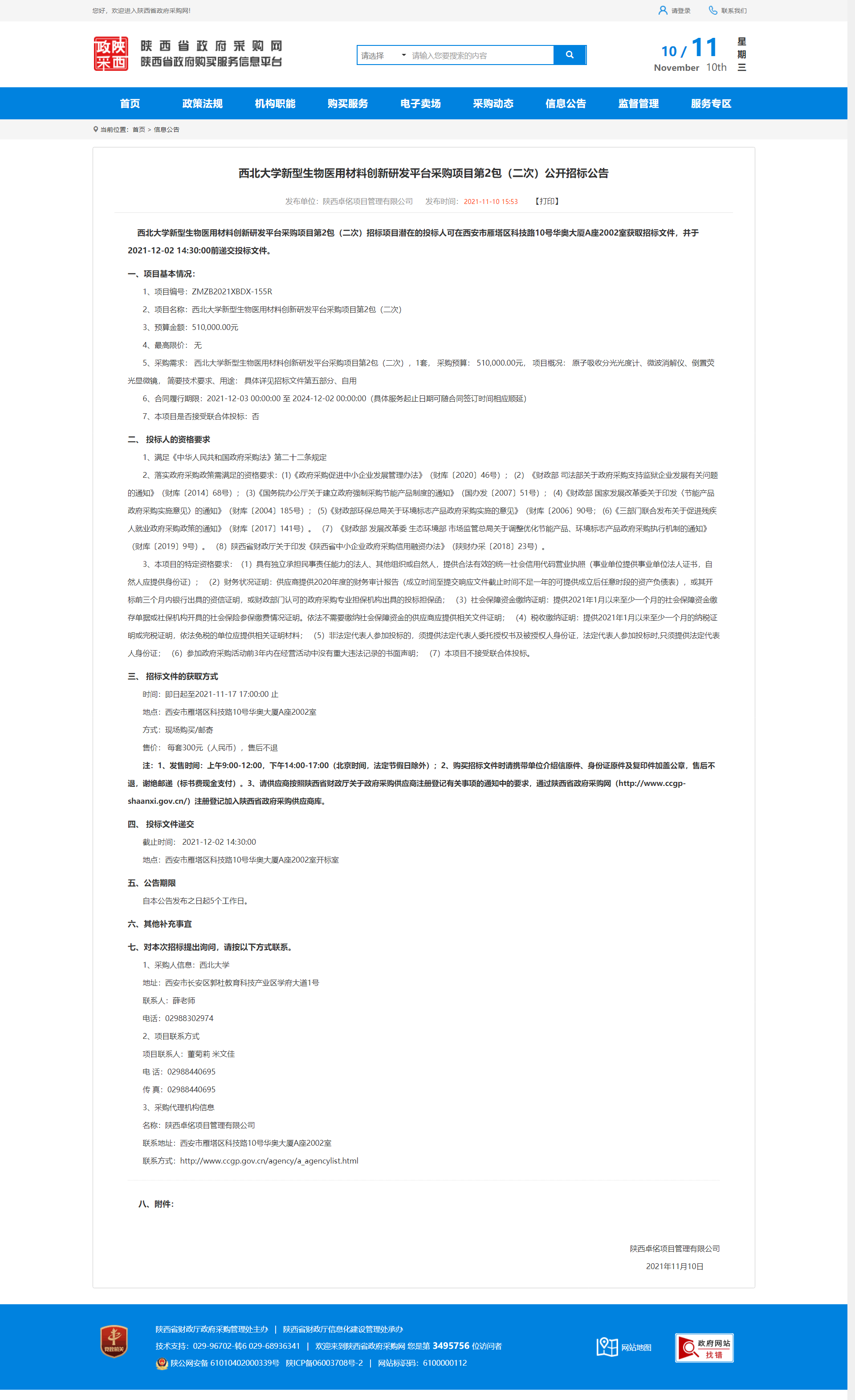 欧冠官方网站新型生物医用材料创新研发平台采购项目第2包(二次)公开招标公告 作者: 编辑:薛利娟 时间:2021-11-10 原公告网址:http://www.ccgp-shaanxi.gov.cn/notice/noticeDetail.do?noticeguid=8a85be347cefc0a5017d07ed8f131470