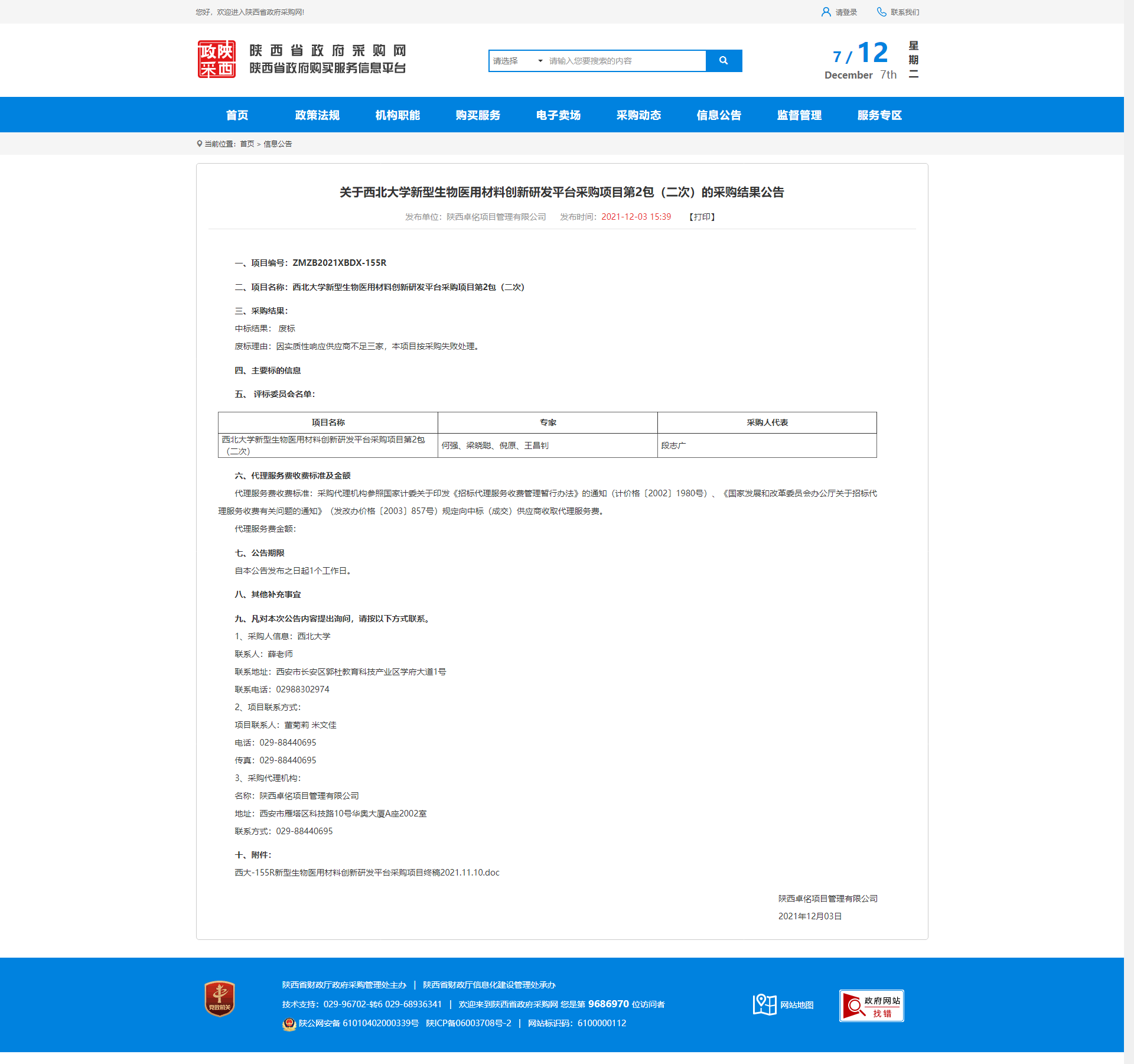 关于欧冠官方网站新型生物医用材料创新研发平台采购项目第2包(二次)的采购结果公告 作者: 编辑:薛利娟 时间:2021-12-07 原公告链接:http://www.ccgp-shaanxi.gov.cn/notice/noticeDetail.do?noticeguid=8a85be347d6a75c8017d7f38c86a62bc