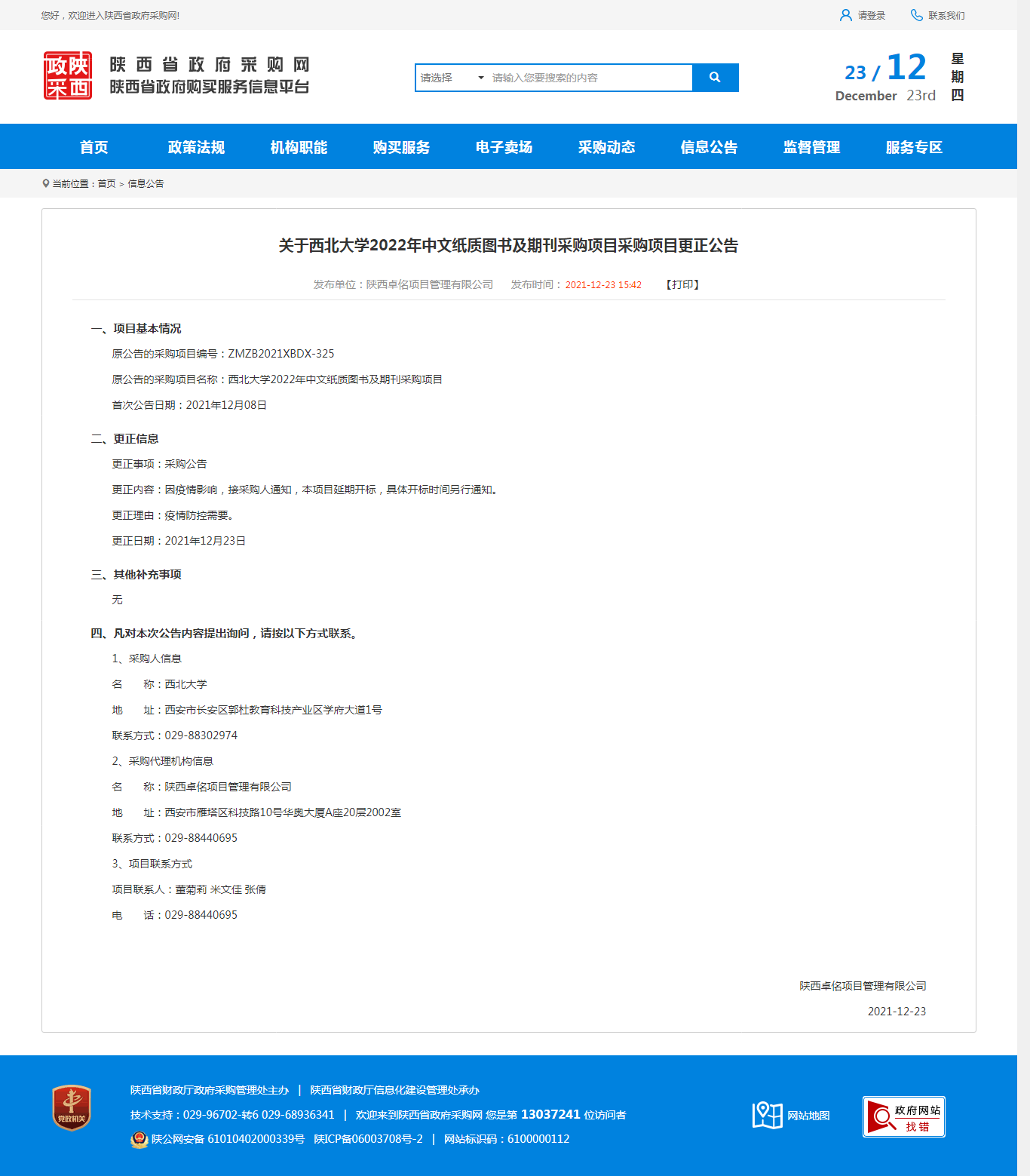 关于欧冠官方网站2022年中文纸质图书及期刊采购项目采购项目更正公告 作者: 编辑:薛利娟 时间:2021-12-23 原公告链接:http://www.ccgp-shaanxi.gov.cn/notice/noticeDetail.do?noticeguid=8a85be327dace5d8017de63c777e2f27