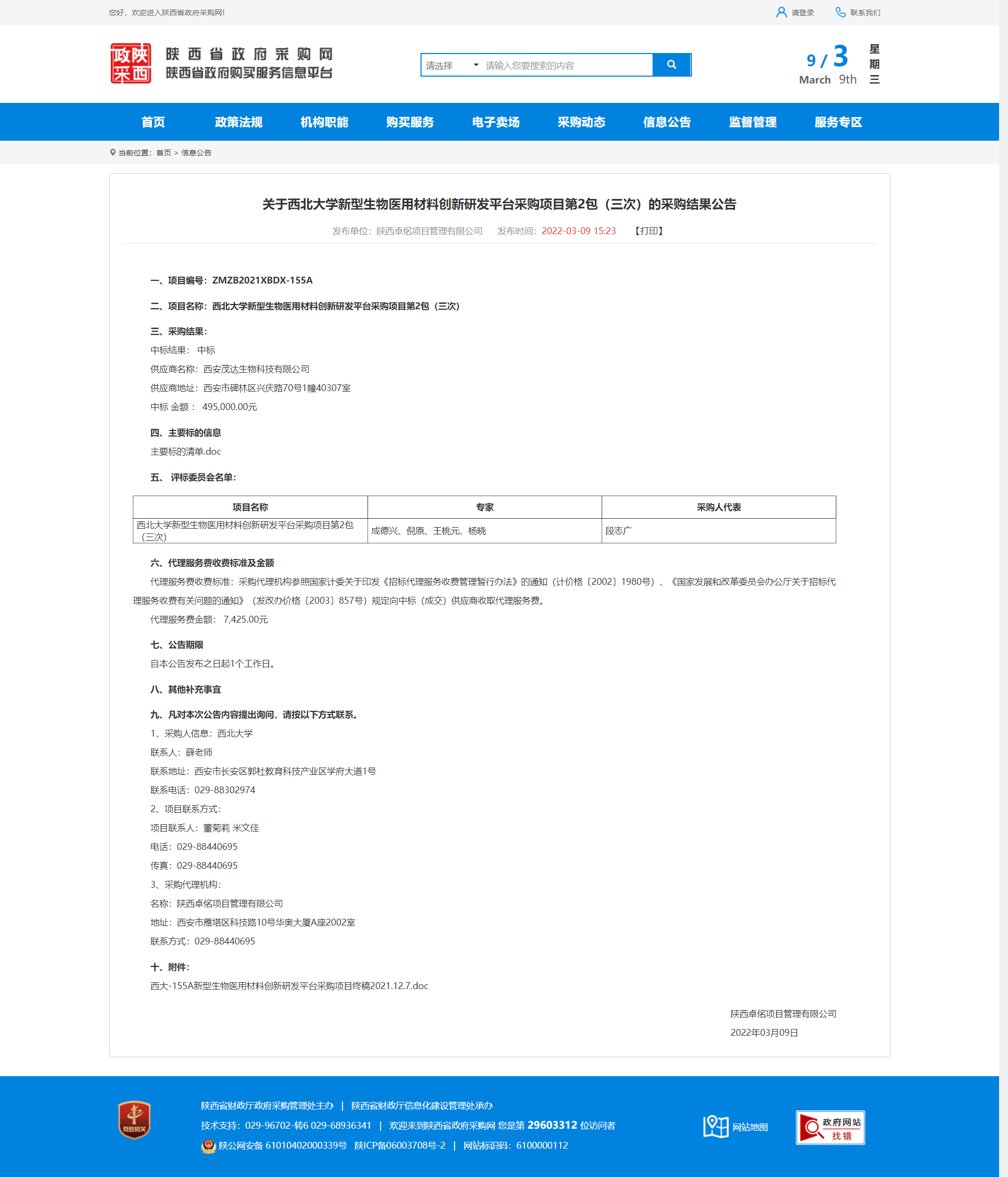 关于欧冠官方网站新型生物医用材料创新研发平台采购项目第2包(三次)的采购结果公告 作者: 编辑:薛利娟 时间:2022-03-09 原公告链接:http://www.ccgp-shaanxi.gov.cn/notice/noticeDetail.do?noticeguid=8a85be317f3fe526017f6d6699050f58