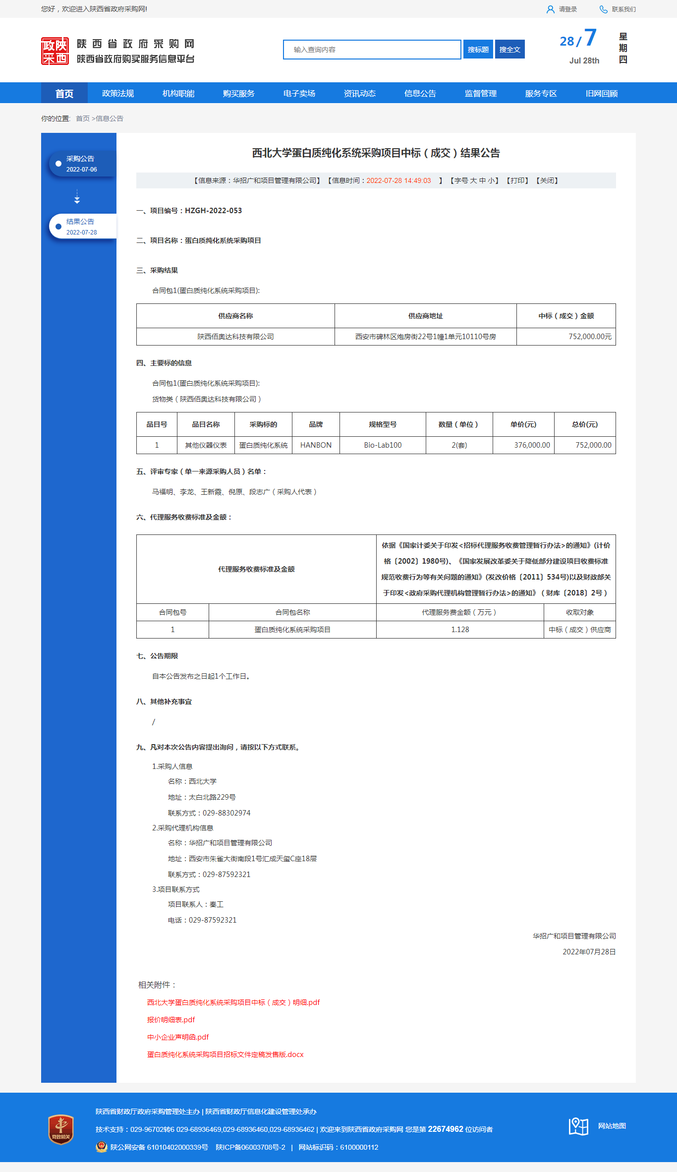 欧冠官方网站蛋白质纯化系统采购项目中标(成交)结果公告 作者: 编辑:采购与招标办公室 时间:2022-07-28 原公告链接:http://www.ccgp-shaanxi.gov.cn/freecms/site/shaanxi/ggxx/info/2022/8a69c0168238f2d801824386c2a86160.html?noticeType=001021¬iceId=c4ccf243-0e41-11ed-9a8e-08c0eb20c666