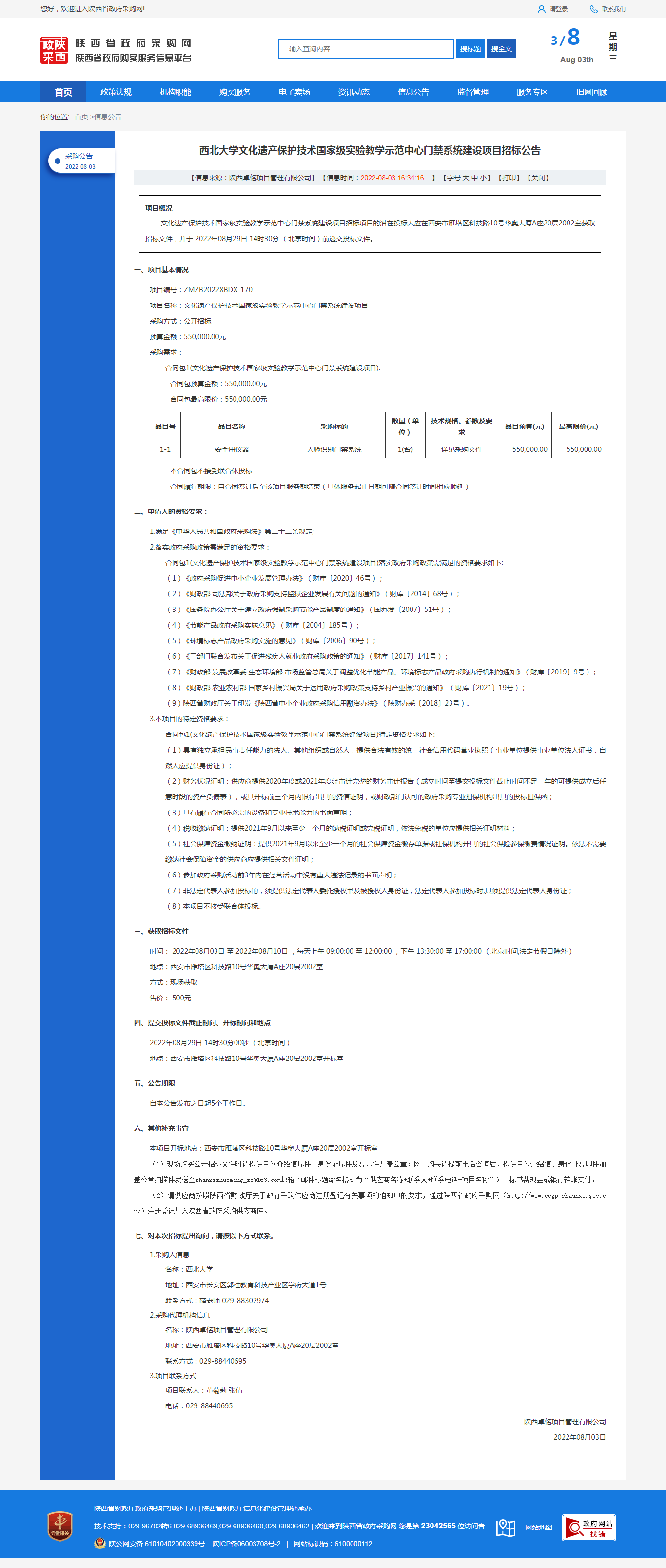 欧冠官方网站文化遗产保护技术国家级实验教学示范中心门禁系统建设项目招标公告 作者: 编辑:采购与招标办公室 时间:2022-08-03 原公告链接:http://www.ccgp-shaanxi.gov.cn/freecms/site/shaanxi/ggxx/info/2022/8a69c15f8238f00c01826158874944be.html?noticeType=001011¬iceId=795f6845-1307-11ed-9a8e-08c0eb20c666