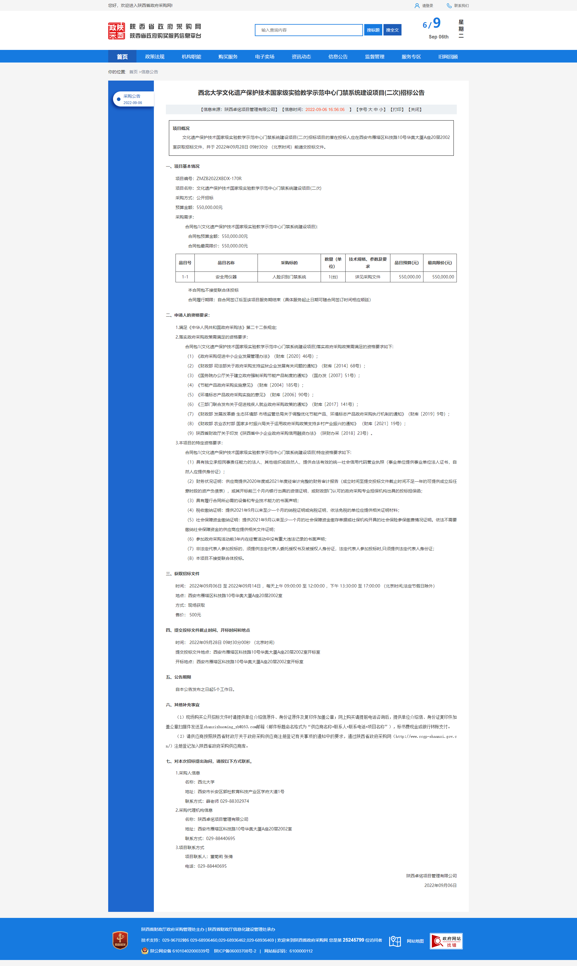 欧冠官方网站文化遗产保护技术国家级实验教学示范中心门禁系统建设项目(二次)招标公告 作者: 编辑:采购与招标办公室 时间:2022-09-06 原公告链接:http://www.ccgp-shaanxi.gov.cn/freecms/site/shaanxi/ggxx/info/2022/8a69c63182a32538018311f9ef2e1370.html?noticeType=001011¬iceId=3d8b61ff-2dc2-11ed-9a8e-08c0eb20c666