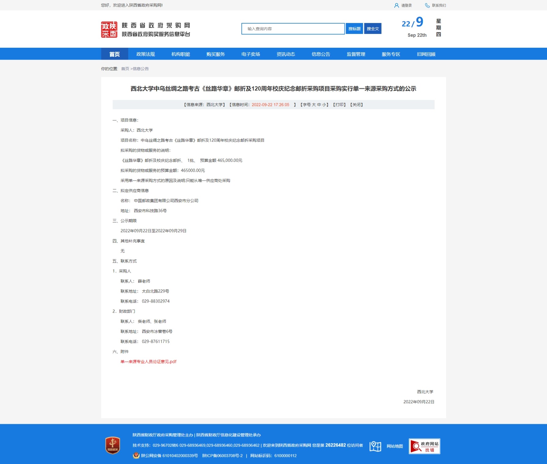 欧冠官方网站中乌丝绸之路考古《丝路华章》邮折及120周年校庆纪念邮折采购项目采购实行单一来源采购方式的公示 作者: 编辑:采购与招标办公室 时间:2022-09-22 原公告链接:http://www.ccgp-shaanxi.gov.cn/freecms/site/shaanxi/ggxx/info/2022/8a69c847835dd63701836466baf9164a.html?noticeType=001051¬iceId=1acb1eb1-3a59-11ed-9a8e-08c0eb20c666