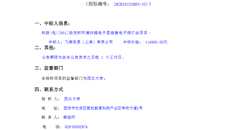 欧冠官方网站场发射环境扫描电子显微镜电子源灯丝项目采购结果公告 作者: 编辑:采购与招标办公室 时间:2023-12-14 原公告链接:http://www.sntba.com/website/gg_show.aspx?id=263188