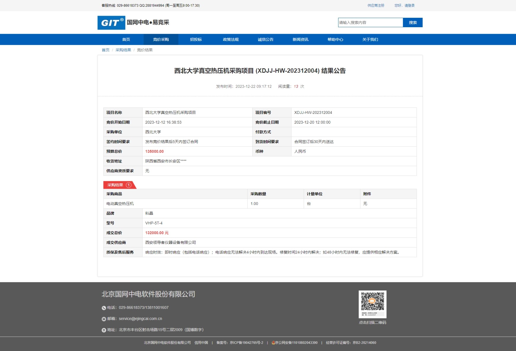 欧冠官方网站真空热压机采购项目 (XDJJ-HW-202312004) 竞价结果公告 作者: 编辑:采购与招标办公室 时间:2023-12-22 原公告链接:https://www.ejingcai.com.cn/site/bidding/detail/7982