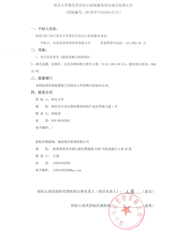 欧冠官方网站黑色页岩岩心钻取服务项目成交结果公告