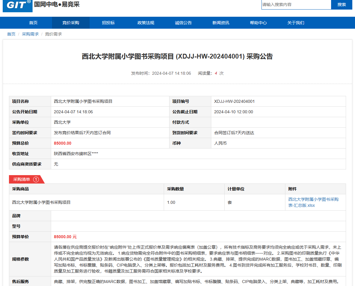 欧冠官方网站附属小学图书采购项目 (XDJJ-HW-202404001) 竞价公告 作者: 编辑: 时间:2024-04-07 原公告链接:https://www.ejingcai.com.cn/site/bidding/detail/9303
