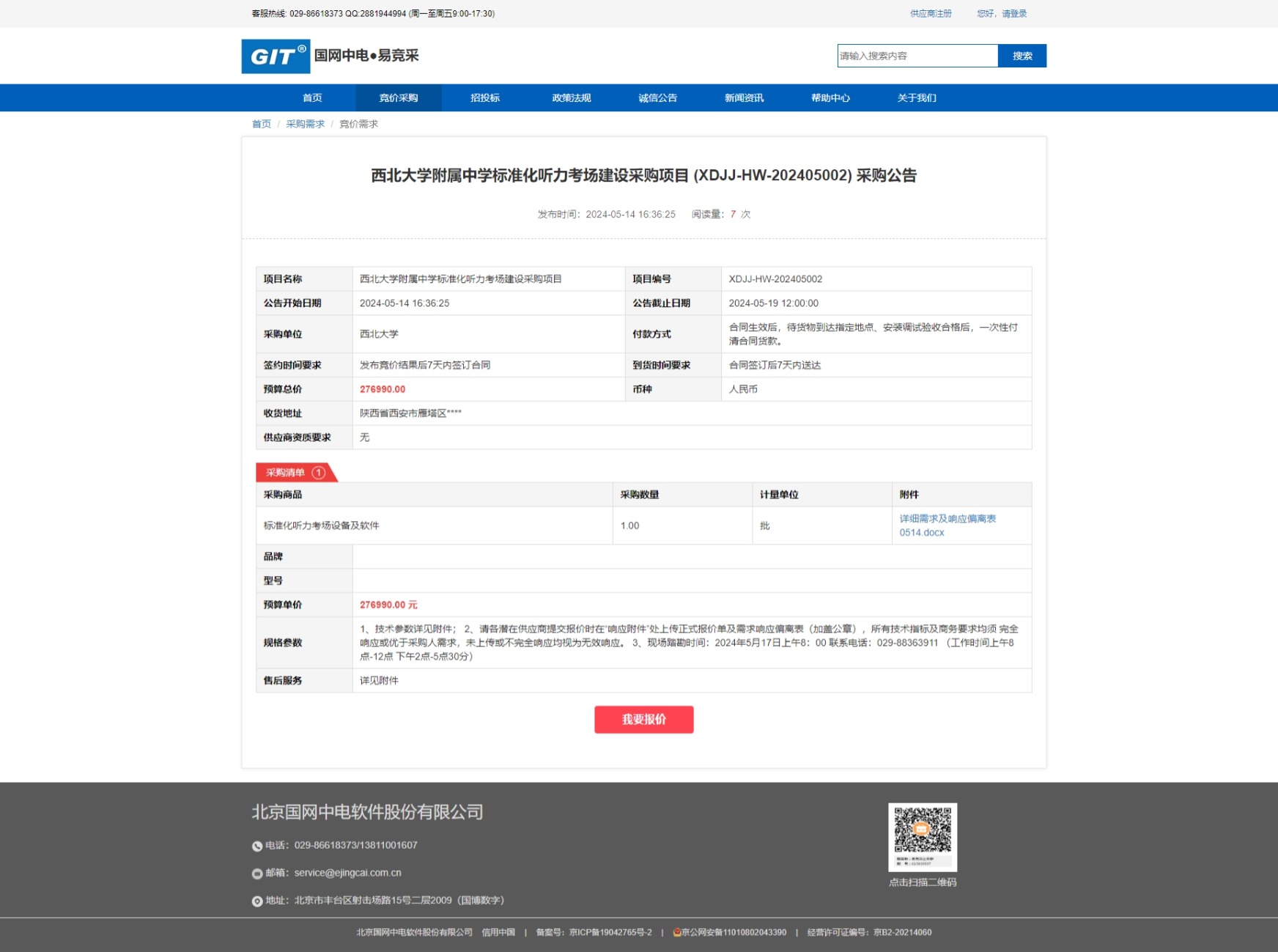 欧冠官方网站附属中学标准化听力考场建设采购项目 (XDJJ-HW-202405002) 竞价采购公告 作者: 编辑:采购与招标办公室 时间:2024-05-14 原公告链接:https://www.ejingcai.com.cn/site/bidding/detail/10191
