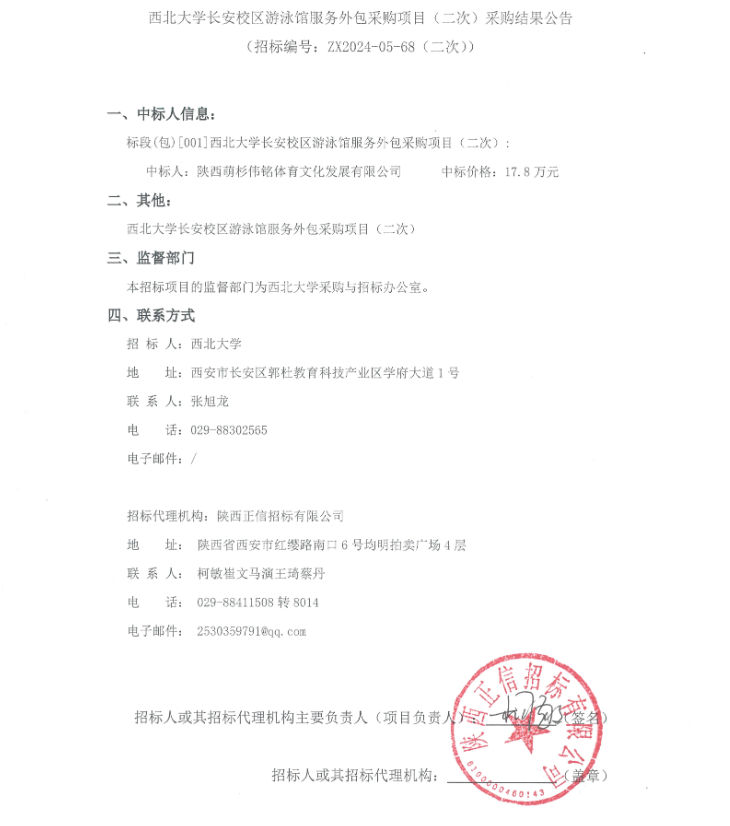 欧冠官方网站长安校区游泳馆服务外包采购项目(二次)采购结果公告