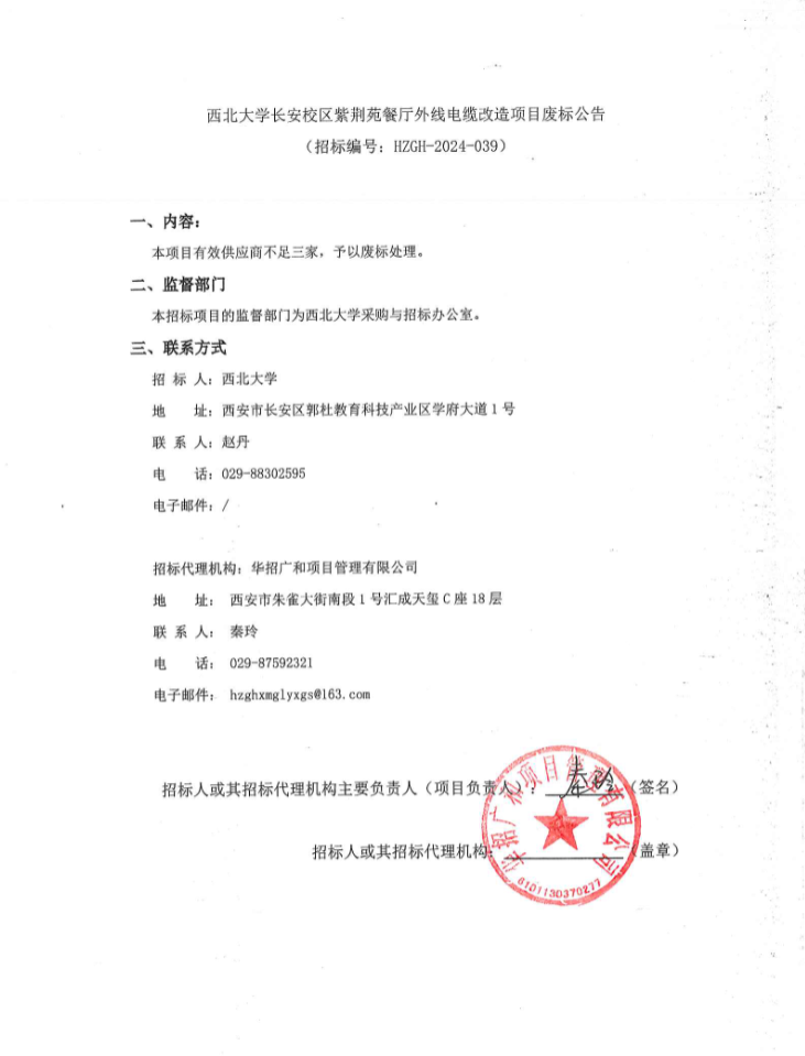 欧冠官方网站长安校区紫荆苑餐厅外线电缆改造项目废标公告