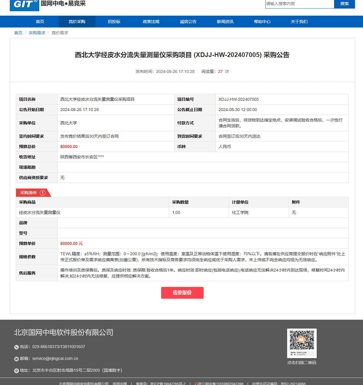 欧冠官方网站经皮水分流失量测量仪采购项目 (XDJJ-HW-202407005) 竞价采购公告 作者: 编辑: 时间:2024-08-27 原公告链接:https://www.ejingcai.com.cn/site/bidding/detail/12213