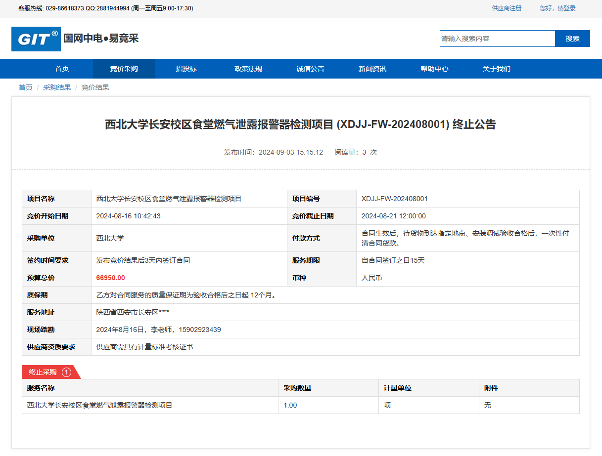 欧冠官方网站长安校区食堂燃气泄露报警器检测项目 (XDJJ-FW-202408001) 竞价终止公告 作者: 编辑: 时间:2024-09-03 原公告链接:https://www.ejingcai.com.cn/site/bidding/detail/12307