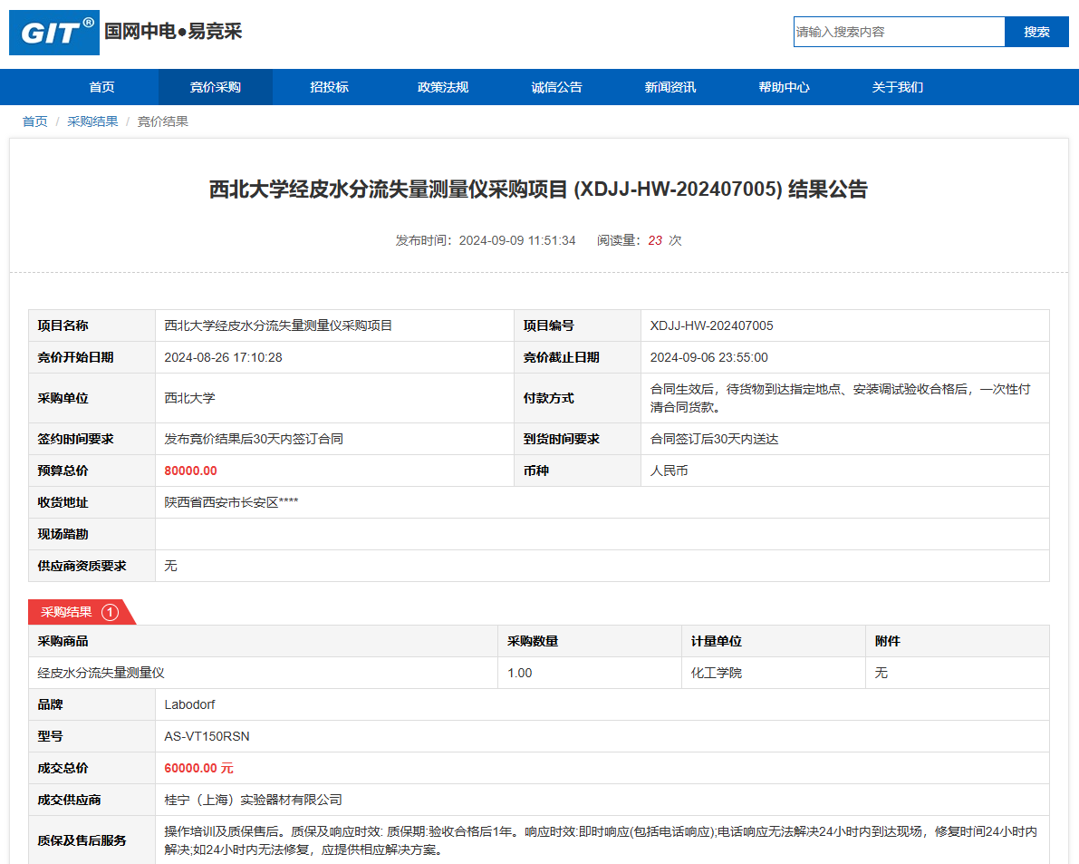 欧冠官方网站经皮水分流失量测量仪采购项目 (XDJJ-HW-202407005) 竞价结果公告 作者: 编辑: 时间:2024-09-09 原公告链接:https://www.ejingcai.com.cn/site/bidding/detail/12405