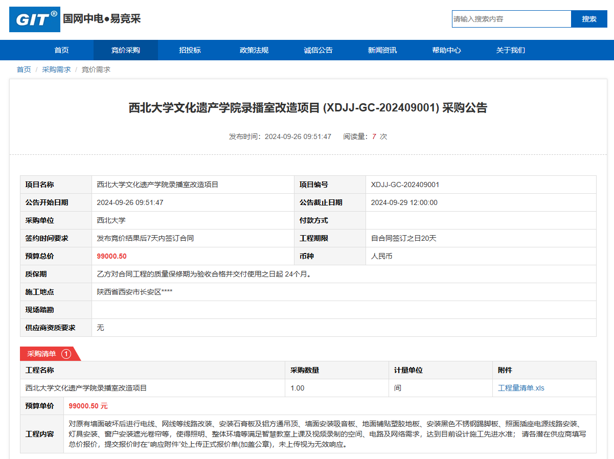 欧冠官方网站文化遗产学院录播室改造项目 (XDJJ-GC-202409001)竞价采购公告 作者: 编辑: 时间:2024-09-26 原公告链接:https://www.ejingcai.com.cn/site/bidding/detail/12907