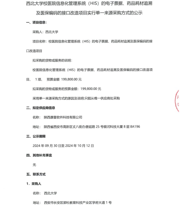 欧冠官方网站校医院信息化管理系统(HIS)电子票据、药品耗材追溯及医保编码接口改造服务项目实行单一来源采购方式的公示