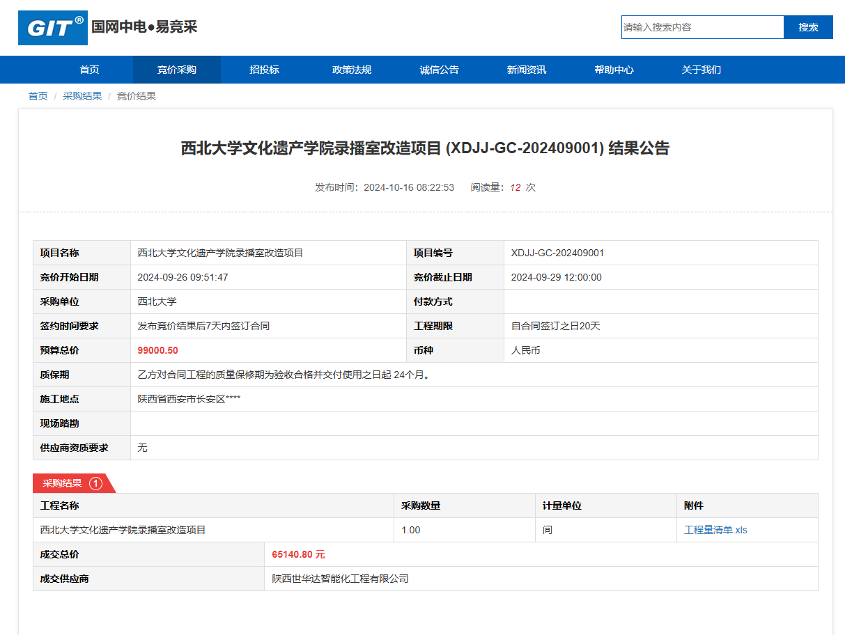 欧冠官方网站文化遗产学院录播室改造项目(XDJJ-GC-202409001)竞价结果公告 作者:采购与招标办公室 编辑: 时间:2024-10-16 原公告链接:https://www.ejingcai.com.cn/site/bidding/detail/13343