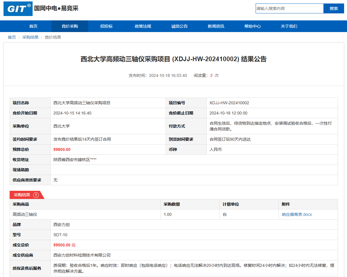 欧冠官方网站高频动三轴仪采购项目(XDJJ-HW-202410002)竞价结果公告 作者:采购与招标办公室 编辑: 时间:2024-10-18 原公告链接:https://www.ejingcai.com.cn/site/bidding/detail/13488