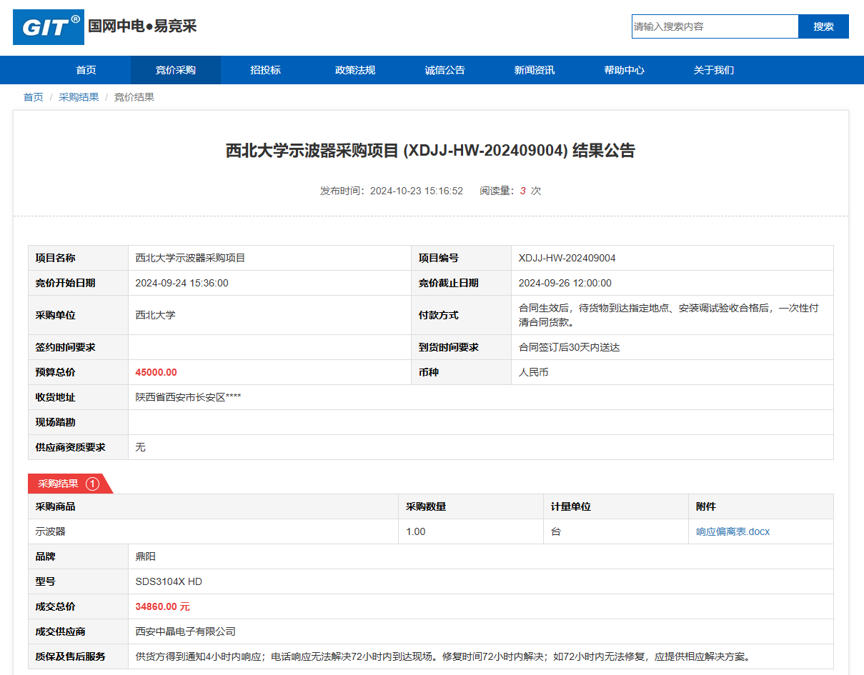 欧冠官方网站示波器采购项目(XDJJ-HW-202409004)竞价结果公告 作者:采购与招标办公室 编辑: 时间:2024-10-23 原公告链接:https://www.ejingcai.com.cn/site/bidding/detail/13693