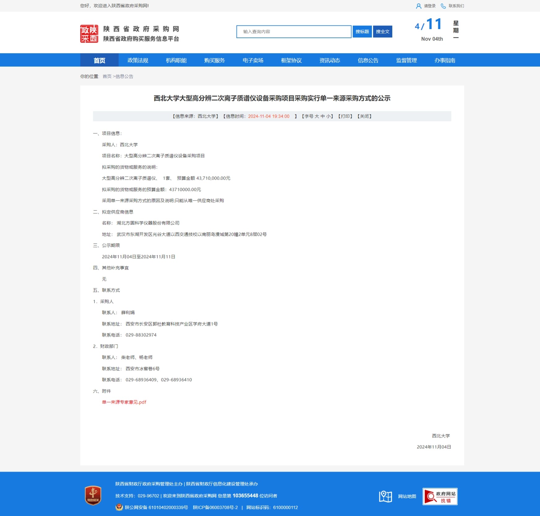 欧冠官方网站大型高分辨二次离子质谱仪设备采购项目采购实行单一来源采购方式的公示 作者: 编辑:采购与招标办公室 时间:2024-11-04 原公告链接:https://www.ccgp-shaanxi.gov.cn/freecms/site/shaanxi/ggxx/info/2024/8a69c95c927dd5a50192f6aef7d343e4.html?noticeType=001051¬iceId=3c0a8bad-9aa2-11ef-8063-08c0eb20c666