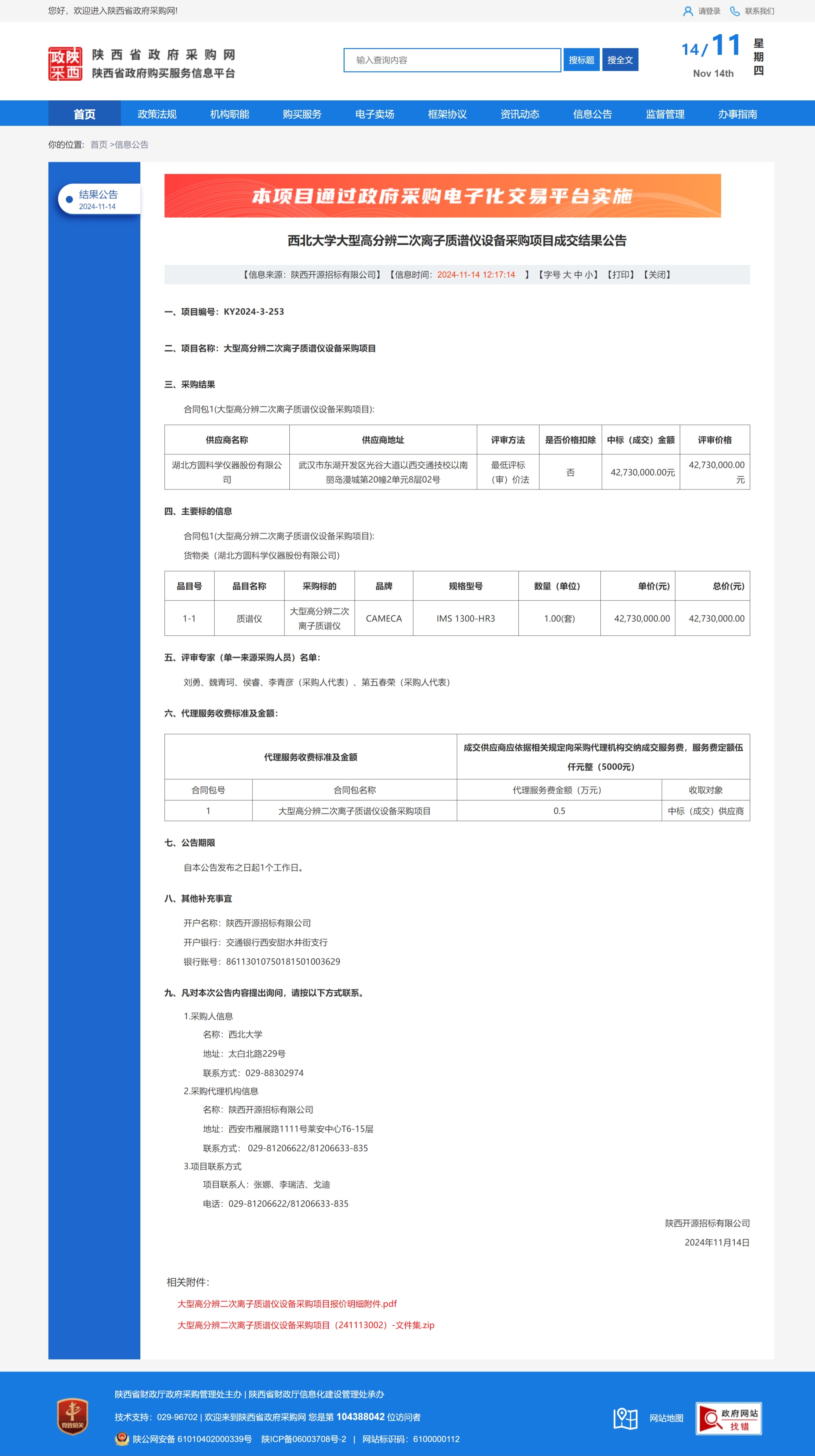 欧冠官方网站大型高分辨二次离子质谱仪设备采购项目成交结果公告 作者: 编辑:薛利娟 时间:2024-11-14 原公告链接:https://www.ccgp-shaanxi.gov.cn/freecms/site/shaanxi/ggxx/info/2024/8a69c5a59218576d019328dcd1526537.html?noticeType=001025¬iceId=e4e285ed-a240-11ef-8063-08c0eb20c666