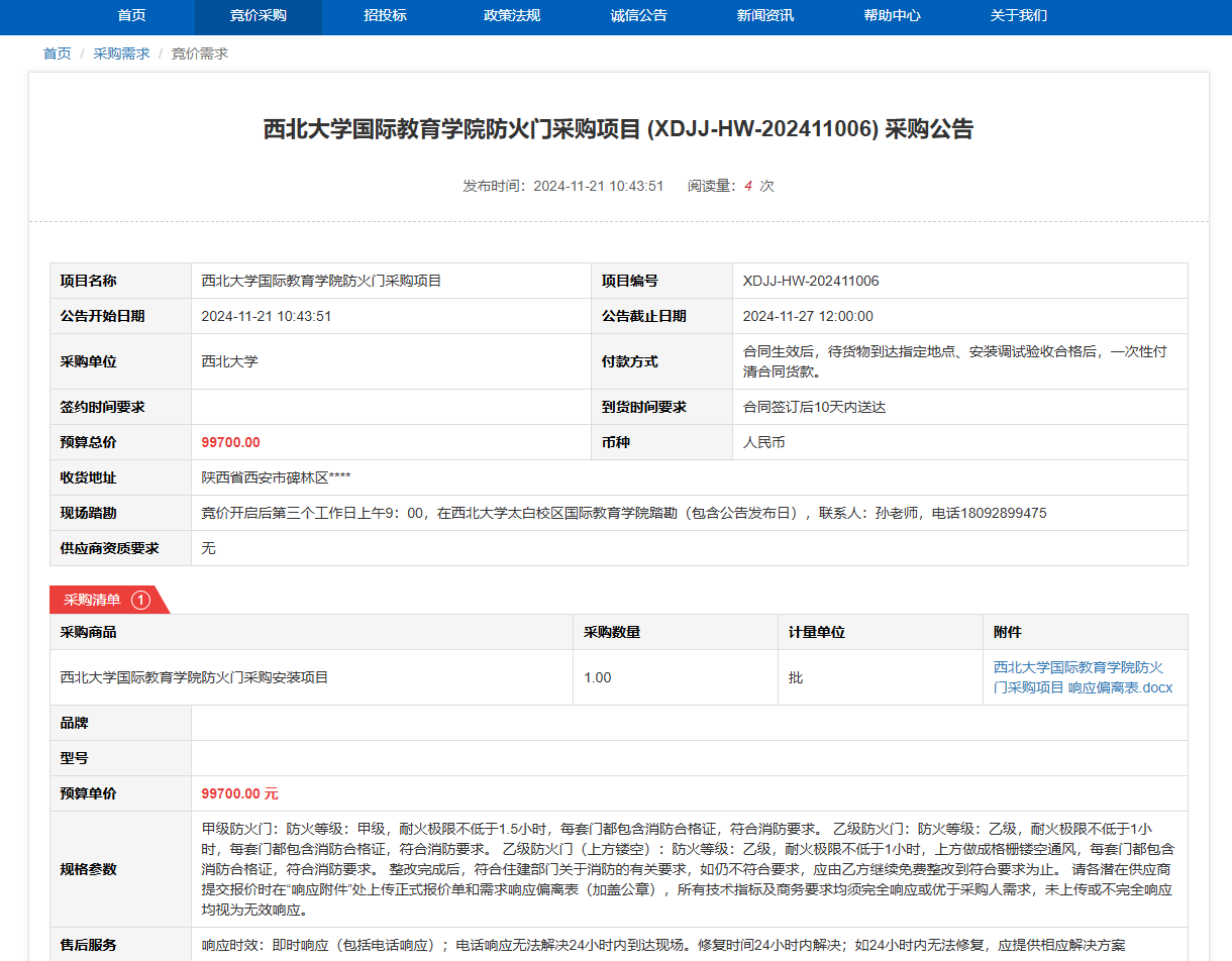 欧冠官方网站国际教育学院防火门采购项目(XDJJ-HW-202411006)竞价采购公告 作者:采购与招标办公室 编辑: 时间:2024-11-21 原公告链接:https://www.ejingcai.com.cn/site/bidding/detail/15182